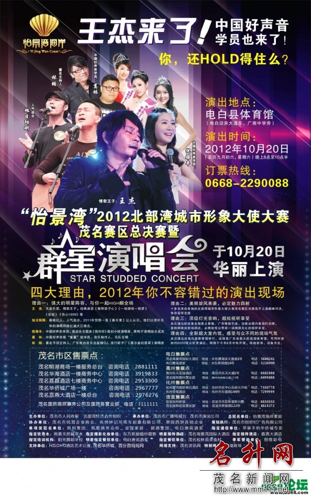 “可以笑的话,不会哭,可找到知己,那会孤独------”,一曲“谁明浪子心”让王杰红遍大江南北,也陪伴着70后一代人慢慢成长。“怡景湾”2012北部湾城市形象大使大赛茂名总决赛暨群星演唱会,将于10月20日(星期六)晚上20:00分在电白体育馆隆重举行。作为演唱会的主打歌手,港台红歌星王杰将莅临电白体育馆与我们近距离接触,受主办方邀请茂名市义工协会将组织义工参与演唱会现场的安保,秩序的维持,座位引导等相关工作,现作如下召集: