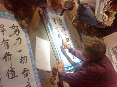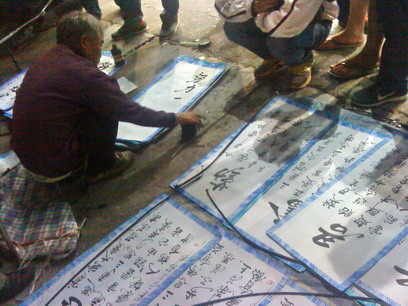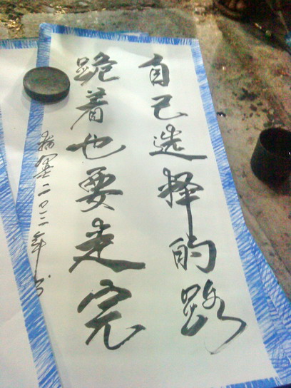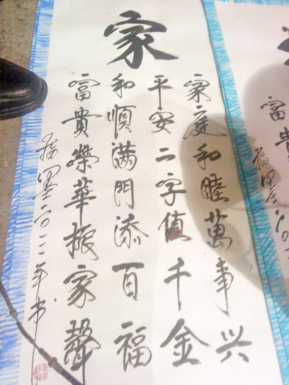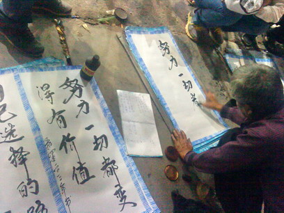 今晚走在街头,见多人围观,好奇近观,只见一白发老人正在用右手指沾上墨汁在一张长方形白纸张上写着诗词,在旁祥听,原来此老人户籍广西姓廖,手机1599xxxxxxx,在水东各街头从事此手艺一段时间,诙家正在写的是在场客人订写的词句,而旁边已写好铺设在地上的可能也是有些客人订好的?可能是在等墨汁干了再来付款领取吧?而每张诗词价格伍元,听有客人说不算贵?都是靠手艺稳食,觉得挺靠谱,你怎么看
