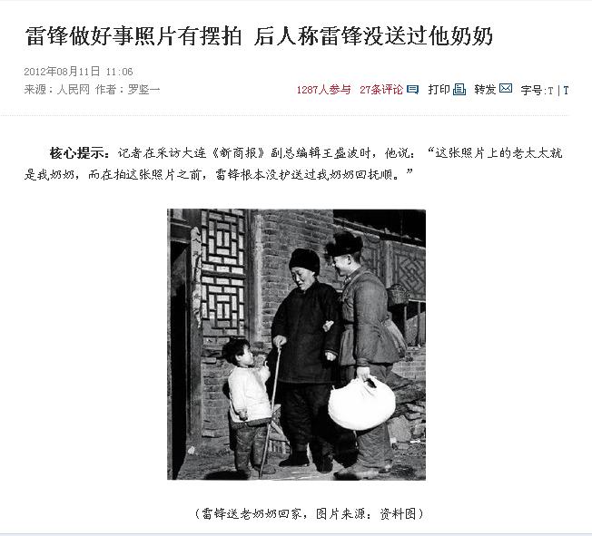【雷锋做好事照片有摆拍】记者在采访大连《新商报》副总编辑王盛波时,他说:“这张照片上的老太太就是我奶奶,而在拍这张照片之前,雷锋根本没护送过我奶奶回抚顺。”“那时,雷锋已经成了全国人民的偶像,人人都在学雷锋。在那个背景下,这样的消息是不能公之于众的。