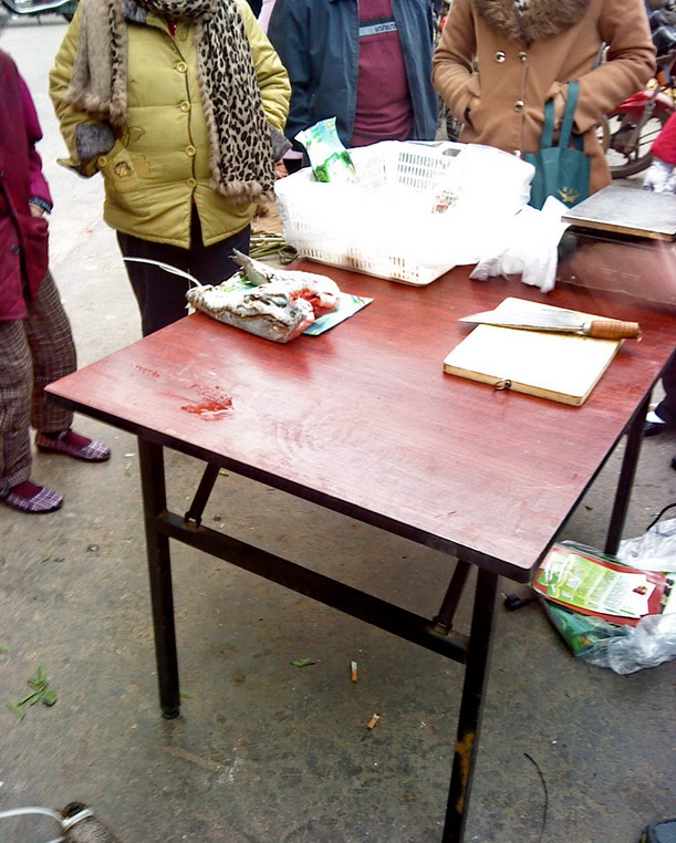 事发今日在水东西湖门囗斜角,刚巧途经,现场有很多人围观,也算俺一个,桌面上有血淋淋的鳄鱼头部与身体各部,其中有些放在胶篮里,那些就不上传了,隐若听到68元一斤,诂计是养殖的吧?也听有群众说这是国家保护动物等话语...,俺有事先走一步,过后的情境就不详了.