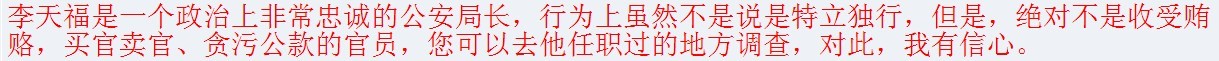 李天福是一个政治上非常忠诚的公安局长,行为上虽然不是说是特立独行,但是,绝对不是收受贿赂,买官卖官、贪污公款的官员,您可以去他任职过的地方调查,对此,我有信心。