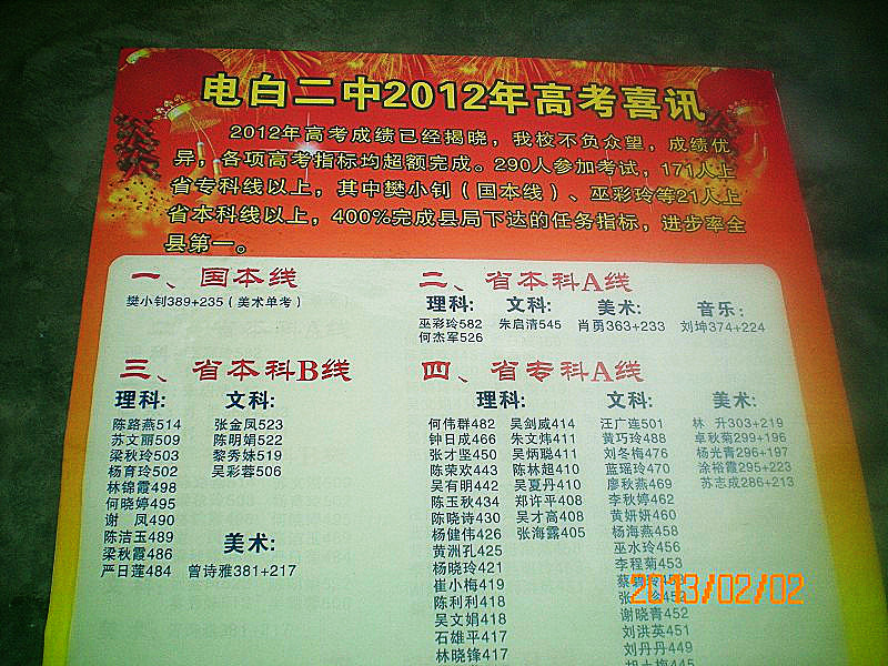 QUOTE(k3503906 @ 2013年02月03日 Sunday, 09:04 PM) 三不如四?悲哀。 [snapback]3493819[/snapback] 二中在大街贴出的榜单,不知二胜三四否。 [attachmentid=308085]