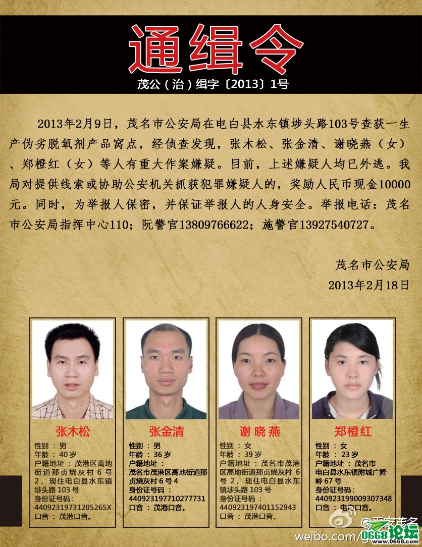 2013年2月9日,茂名市公安局在电白县水东镇锻仿103号查获一生产伪劣脱氧剂产品窝点,经侦查发现,张木松、张金清、谢晓燕(女)、郑橙红(女)等人有重大作案嫌疑。目前,上述嫌疑人均已外逃。我局对提供线索或协助公安机关抓获犯罪嫌疑人的,奖励人民币现金10000元。 [attachmentid=308936]