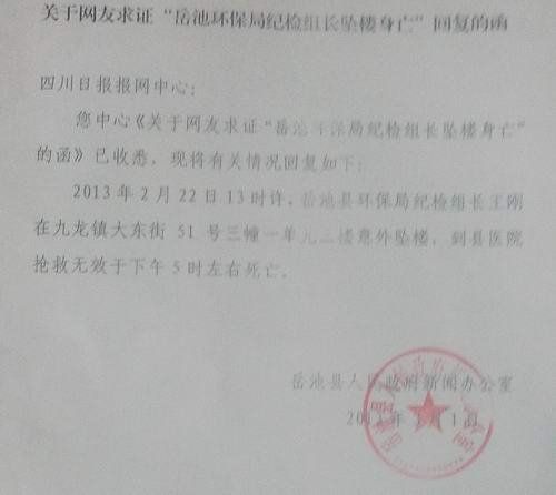 1日15时许,岳池县人民政府新闻办公室给四川日报网发来回复:2013年2月22日13时许,岳池县环保局纪检组长王刚在九龙镇大东街51号三幢一单元三楼意外坠楼,到县医院抢救无效于下午5时左右死亡。(四川日报网)