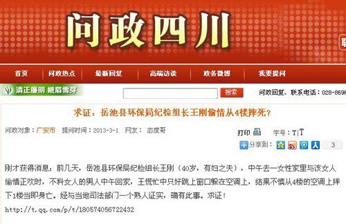 网传四川岳池环保局纪检组长偷情坠亡(图)