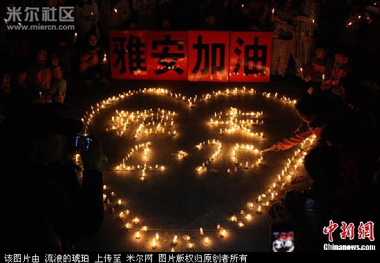 4月22日晚间,江苏盐城近百位市民来到市区盐渎公园为雅安人民祈福活动,市民用蜡烛摆上“雅安”、“4.20”字样,为灾区同胞祈福。图为用蜡烛组成的“雅安”、“4.20”字样。