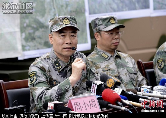 4月22日,成都军区抗震救灾部队在雅安市芦山县召开新闻发布会,成都军区参谋长周小周介绍部队救灾情况。周小周参谋长对记者说:“到现在为止,灾区的三条重要公路,时通时断的问题非常突出。”