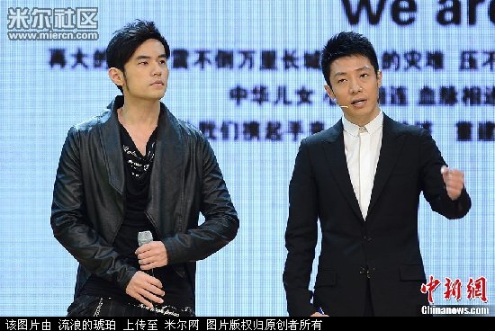 4月22日,周杰伦为雅安芦山灾区捐出100万后,也将电影的宣传活动搁置,原定在北京大学举办的周杰伦导演电影《天台》发布会活动取消,变更为"心系雅安芦山 4.22北大正能量传递活动",这是周杰伦在得知震情后当即做出的决定。周杰伦与主持人撒贝宁一起,完成了这次关于“传递正能量”的对话,与北京大学生一起,为灾区人们加油打气,守望相助他们重建美好的家园。中新社发 李学仕 摄
