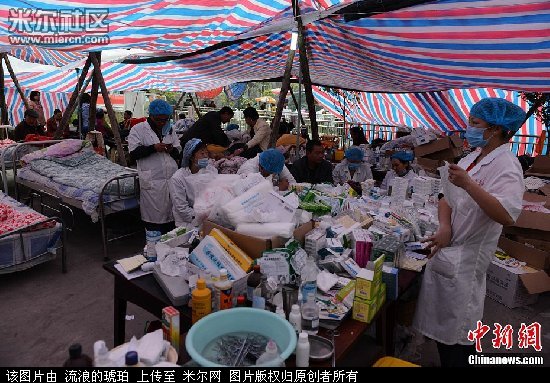 4月22日,几名医疗人员在整理药品。在四川芦山县和平镇政府驻扎的成都军区总医院医疗队,地震以来共救治伤员600百余名,带队政委说:现在最怕的是下雨,因为没有帐篷。