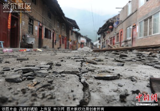 4月22日,百年古镇――芦山双石老街空空荡荡,居民早已从损毁的房屋中撤离,一条裂缝贯穿了整条古镇老街。
