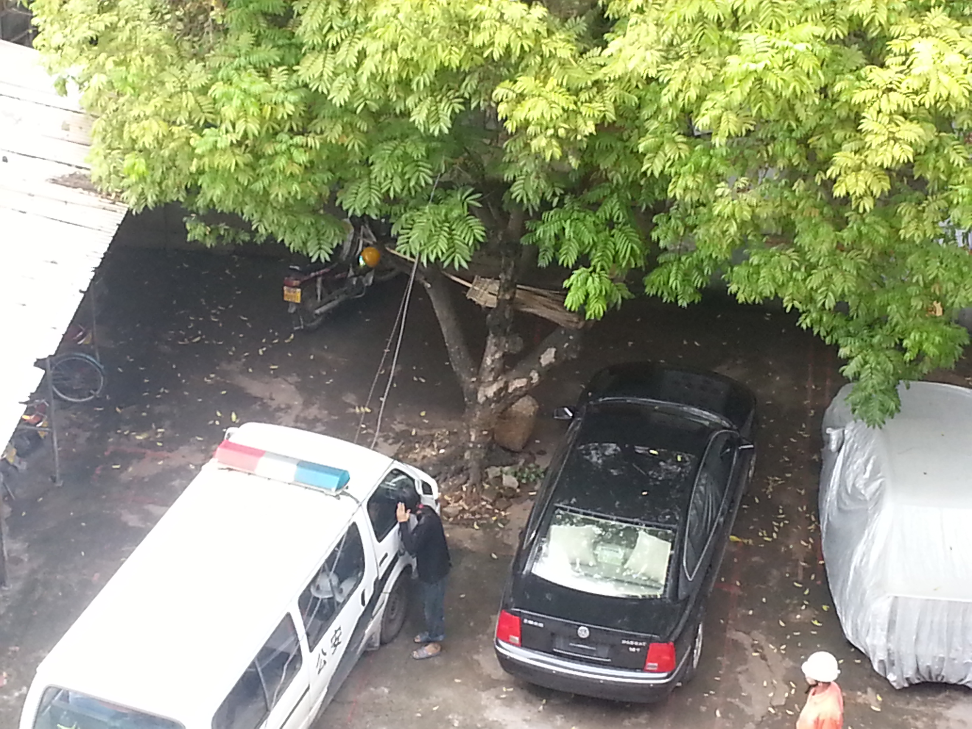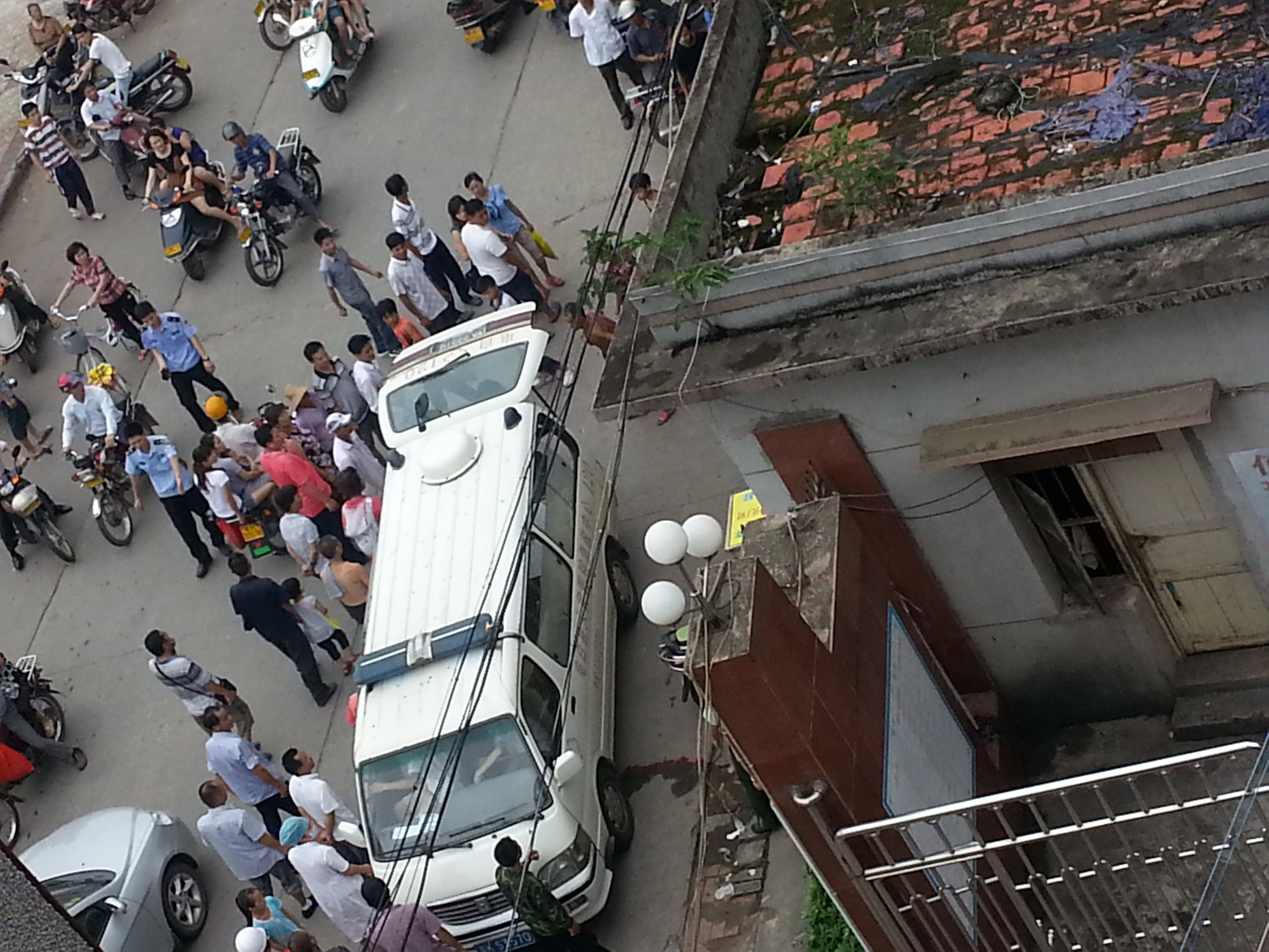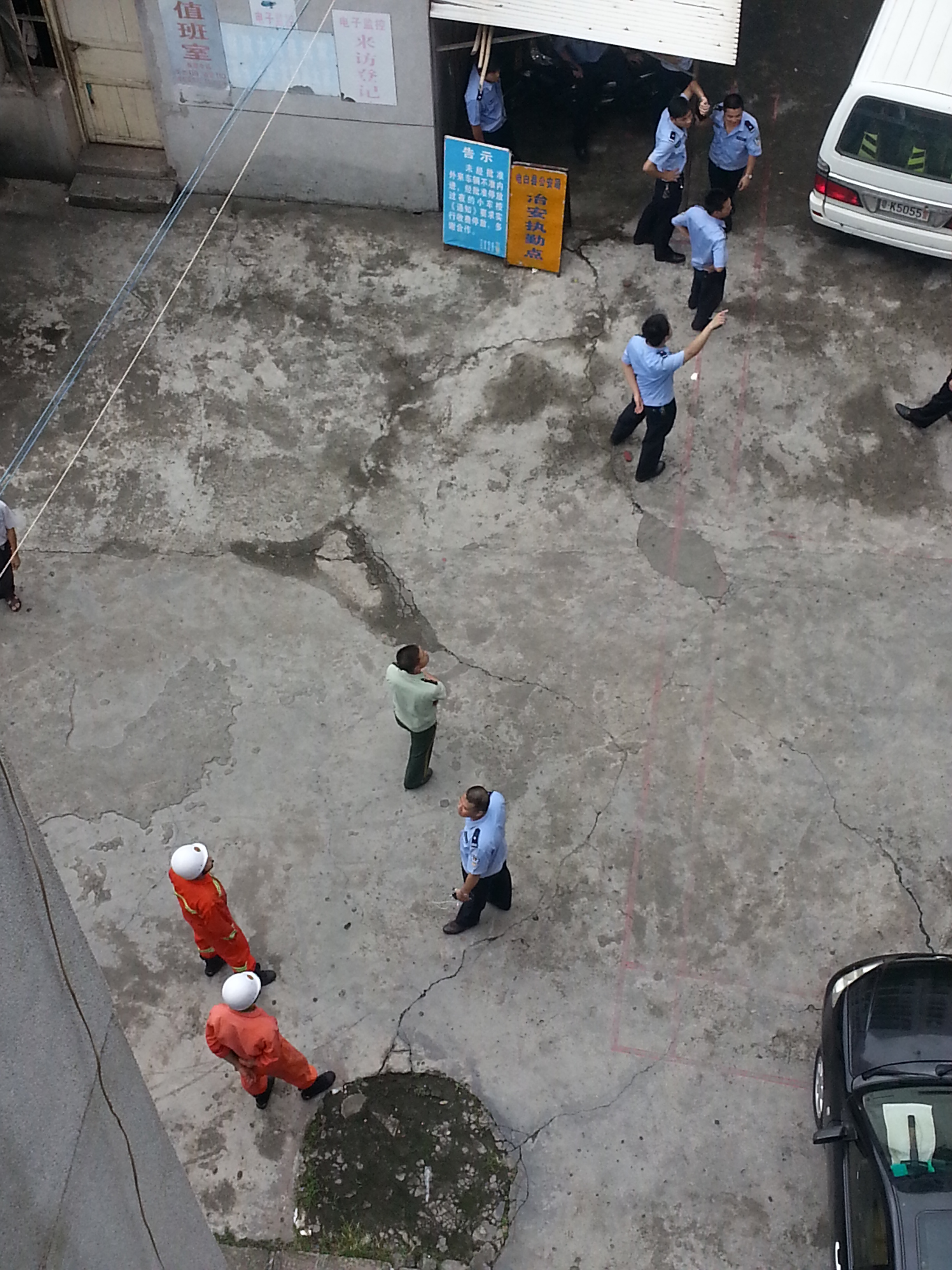 今天中午1时半,一疯子跑到财政所楼顶,一会坐在栏杆上,一会拿砖头向楼下乱丢,门卫报警,几分钟来了10多名警察,一会又来了几位消防人员,也来了救护车。各部门反应及时,先赞一个。
