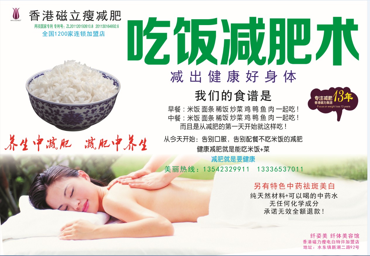香港磁力瘦吃饭减肥术---电白加盟店:纤姿美美容馆新店开业。 同时招美容师,学徒工. 地址:水东镇新湖2路92号(关草田派出所对面),详情13336537011。 新张优惠价: 局部减肥48元/次,当次见效! 洗面250元/10次, 特效中药祛斑350元/7次。 还有去黑头,拨罐,火疗,刷背,肩颈调理,胸部保养等。成本价只为赚人气,欢迎惠顾!