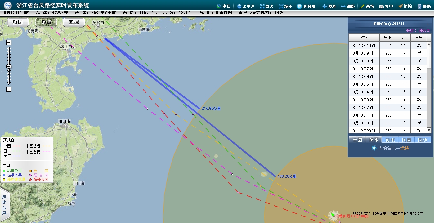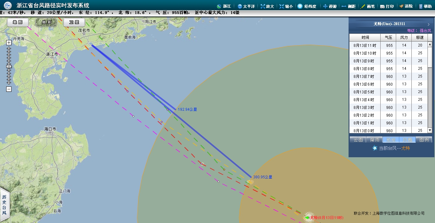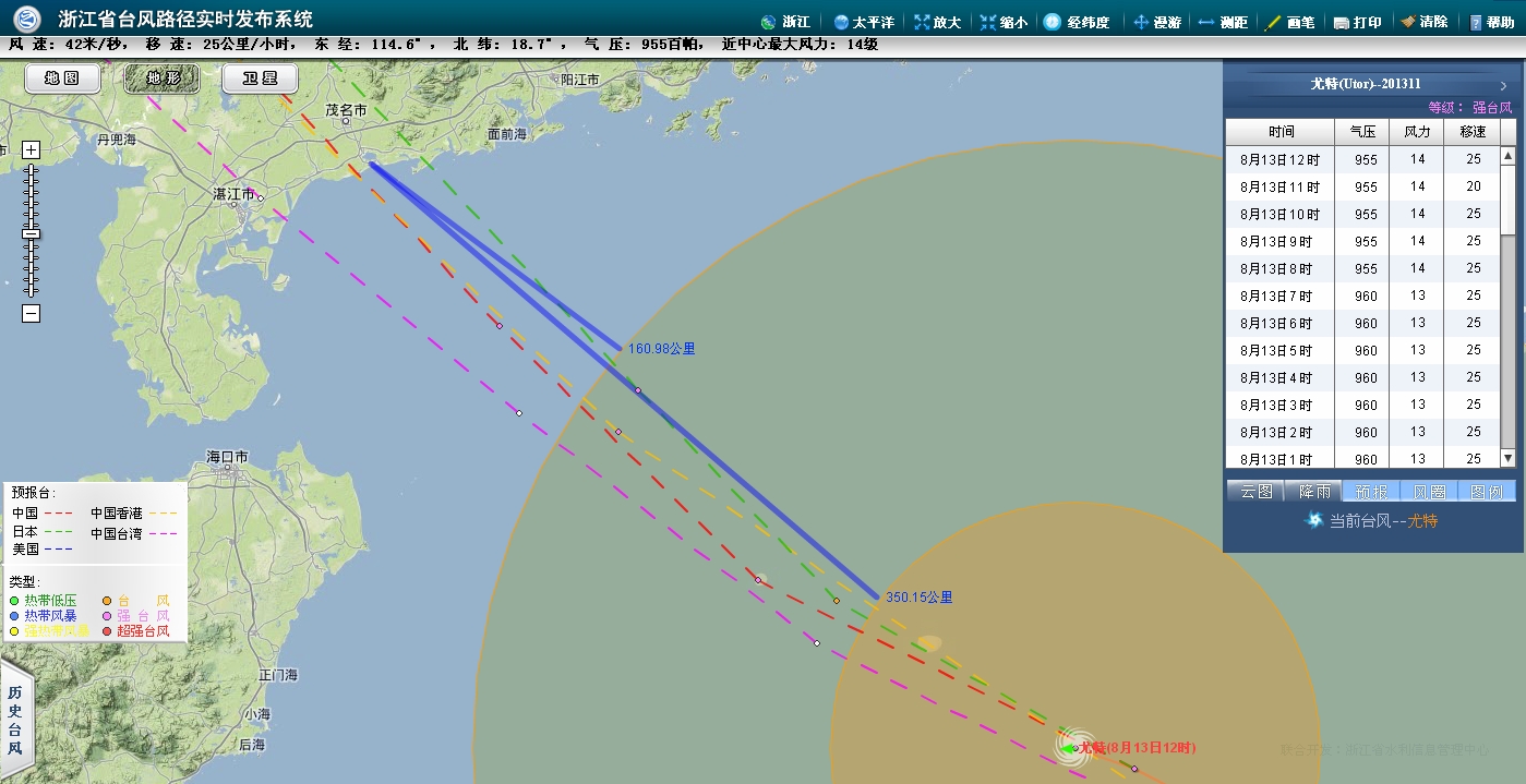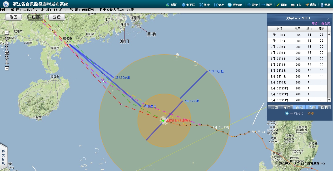 今年第11号台风“尤特”的中心13日07时位于广东茂名东偏南方约640公里的南海北部海面上,北纬18.1度,东经115.7度,中心附近最大风力有13级(40米/秒),中心最低气压为960百帕,七级风圈半径320公里,十级风圈半径130公里。 预计“尤特”将以每小时25公里左右的速度继续向西偏北方向移动,逐渐向广东西部到海南东部一带沿海靠近,强度还将有所增强,并将于14日下午到晚上在广东阳江到海南琼海一带沿海登陆。 徐闻至阳江之间登陆,电白正在中心,