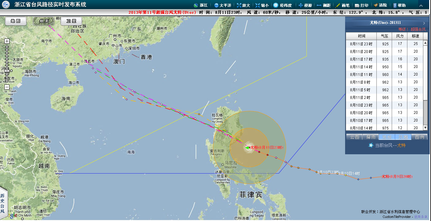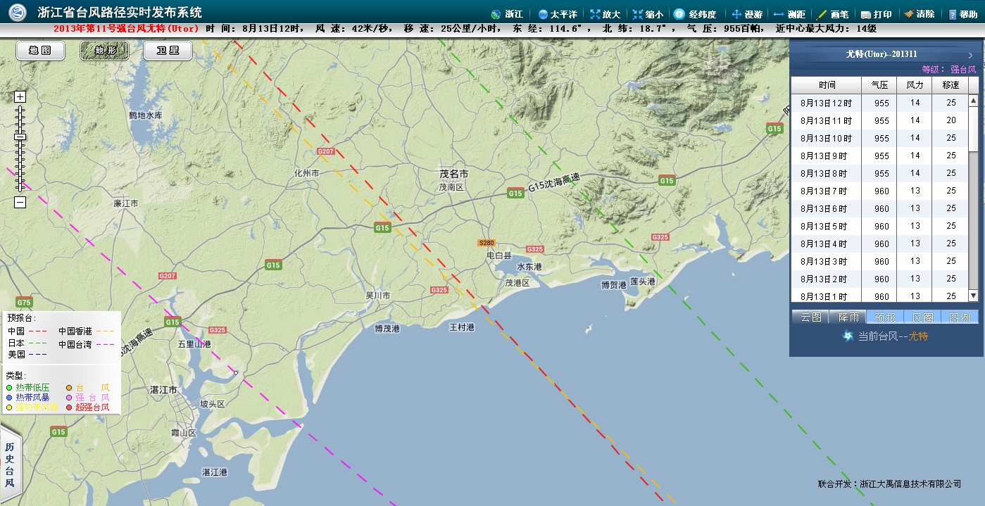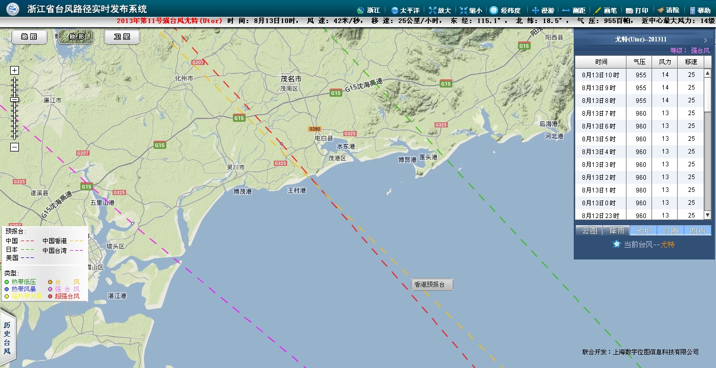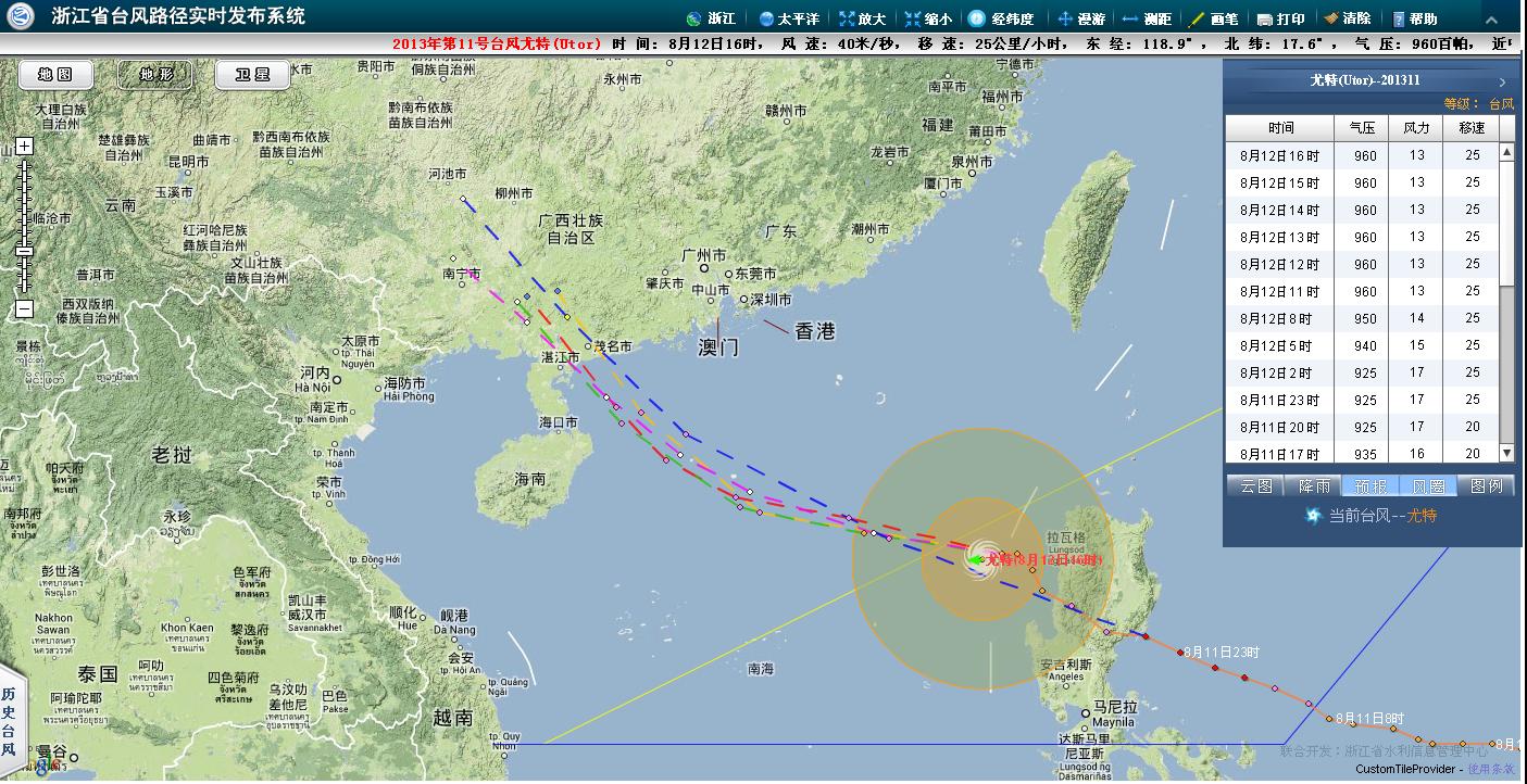 今年第11号台风“尤特”的中心13日07时位于广东茂名东偏南方约640公里的南海北部海面上,北纬18.1度,东经115.7度,中心附近最大风力有13级(40米/秒),中心最低气压为960百帕,七级风圈半径320公里,十级风圈半径130公里。 预计“尤特”将以每小时25公里左右的速度继续向西偏北方向移动,逐渐向广东西部到海南东部一带沿海靠近,强度还将有所增强,并将于14日下午到晚上在广东阳江到海南琼海一带沿海登陆。 徐闻至阳江之间登陆,电白正在中心,