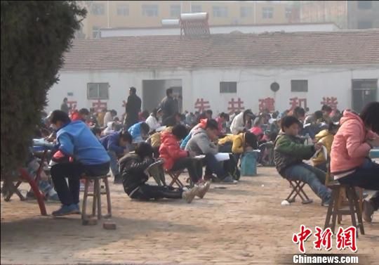 紧邻台前县政府1公里之遥的城镇中学,由于教室不充裕,学生在室外空地上考试。董飞 摄