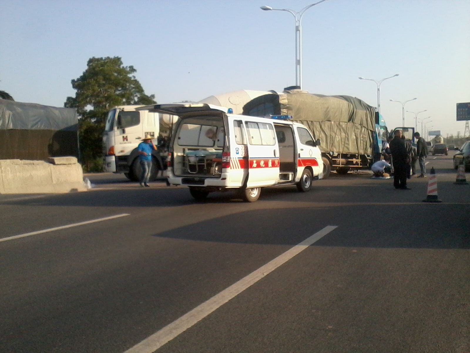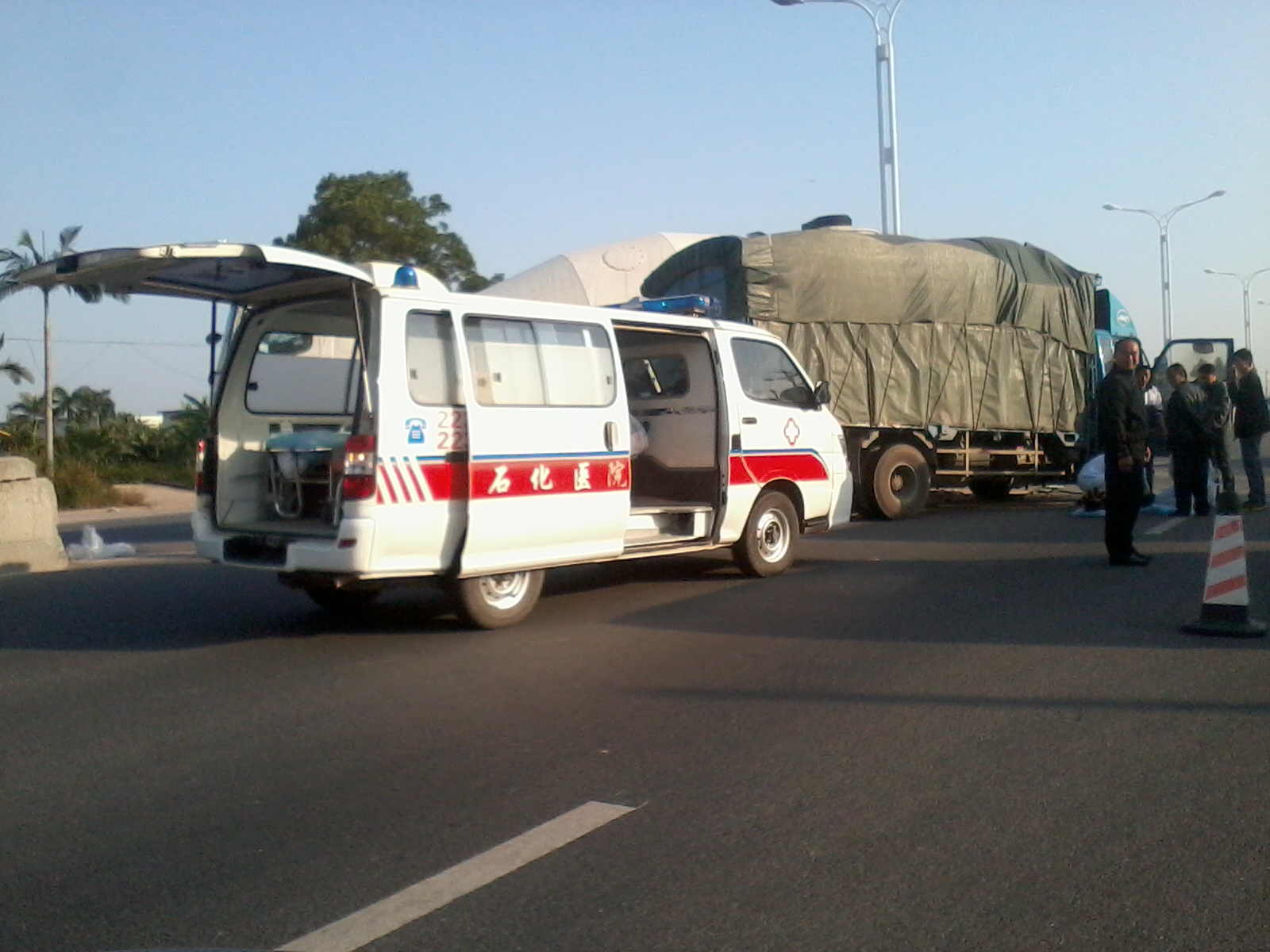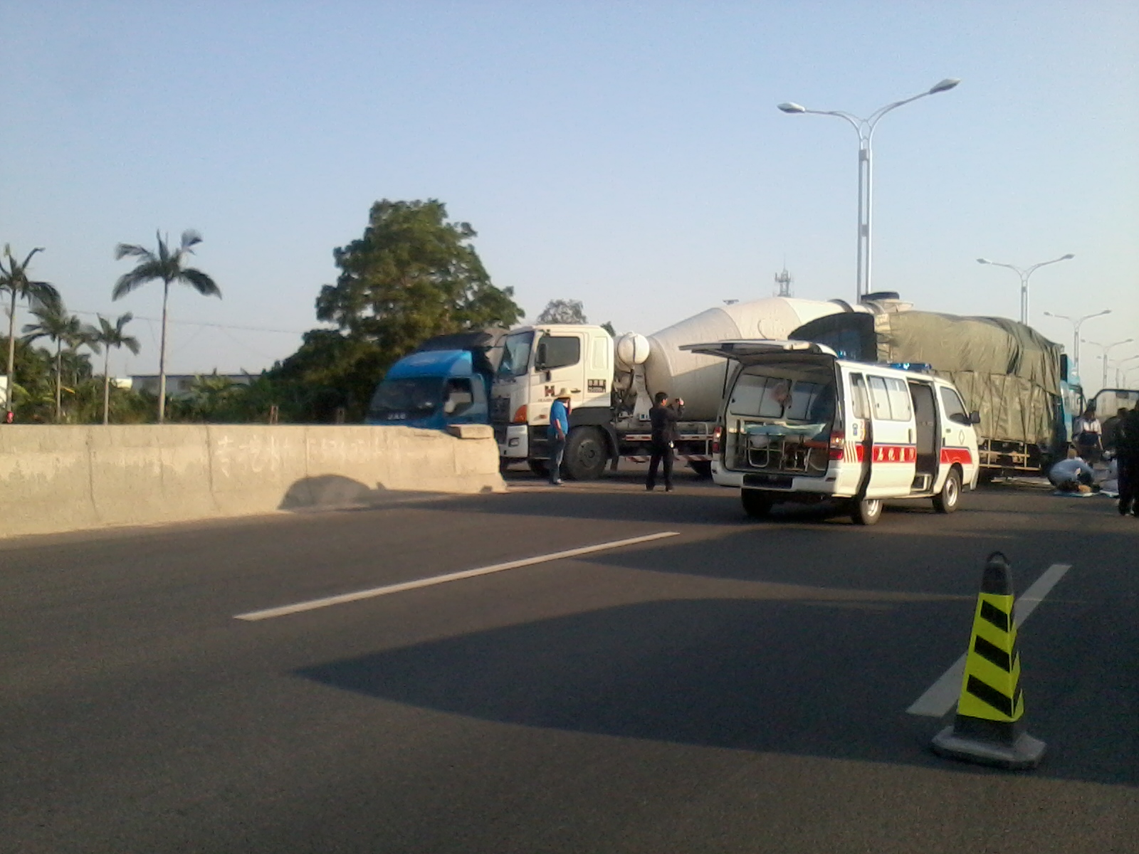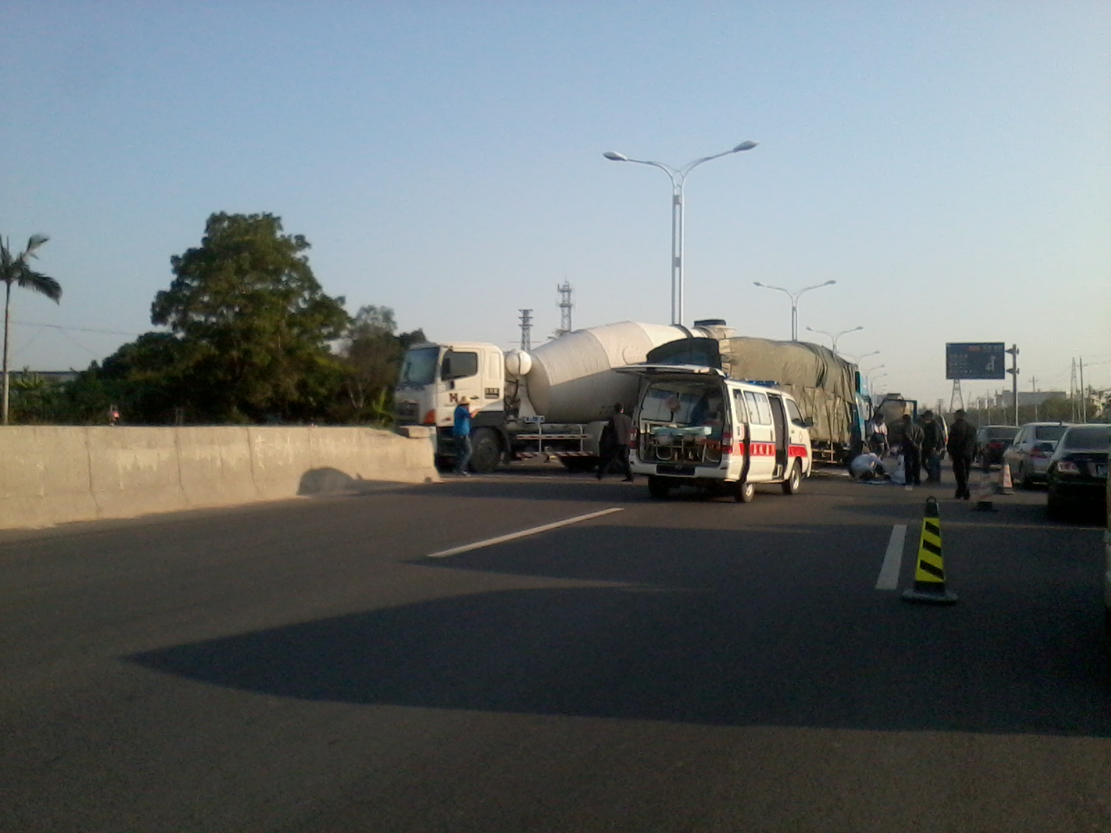 今天下午4点左右,在乙烯工业区高水路段,疑一辆田螺车横过高水路调头,另一辆货车减速不及,亲上了,造成货车头重伤,司机由救护车接走。