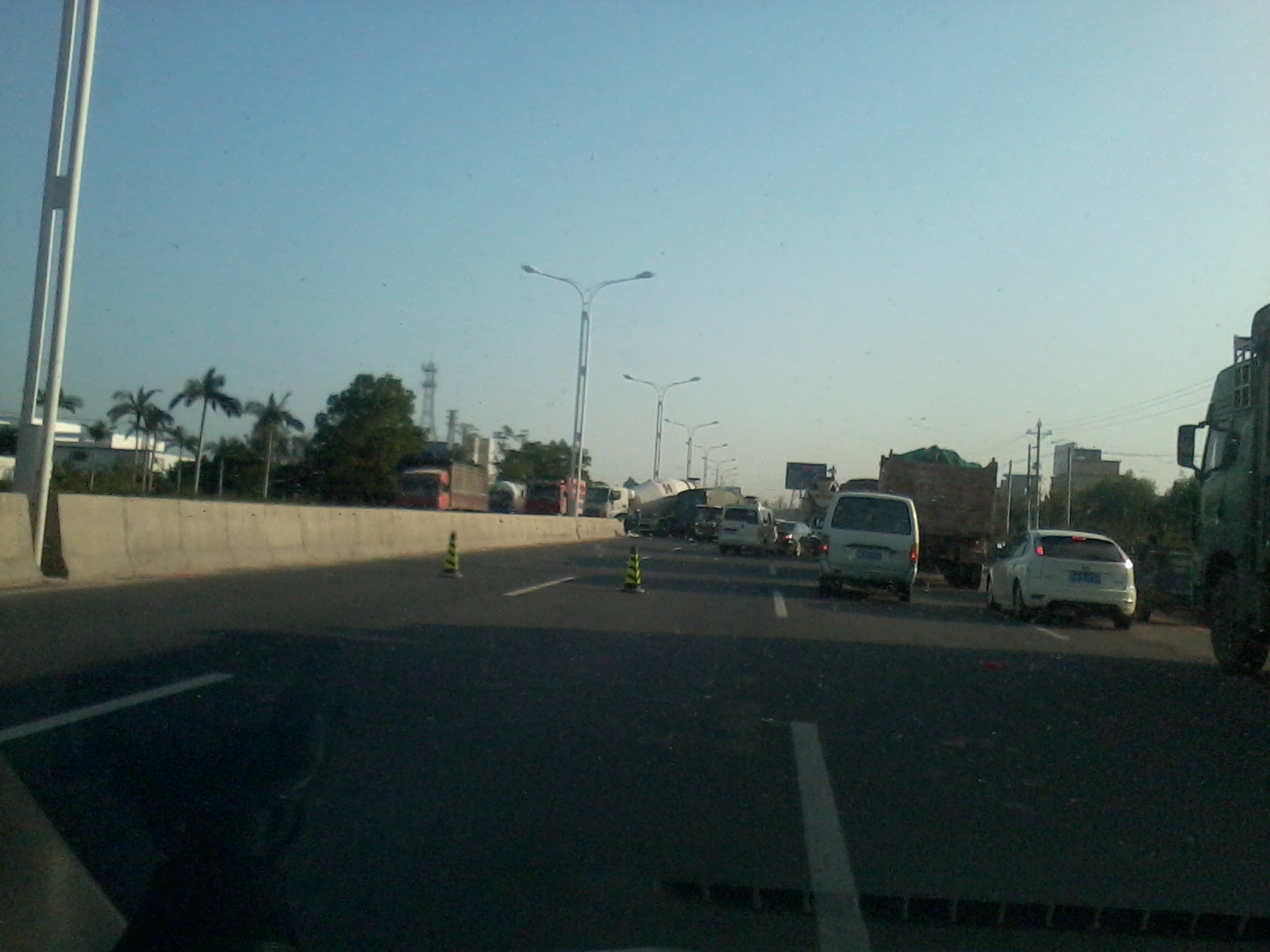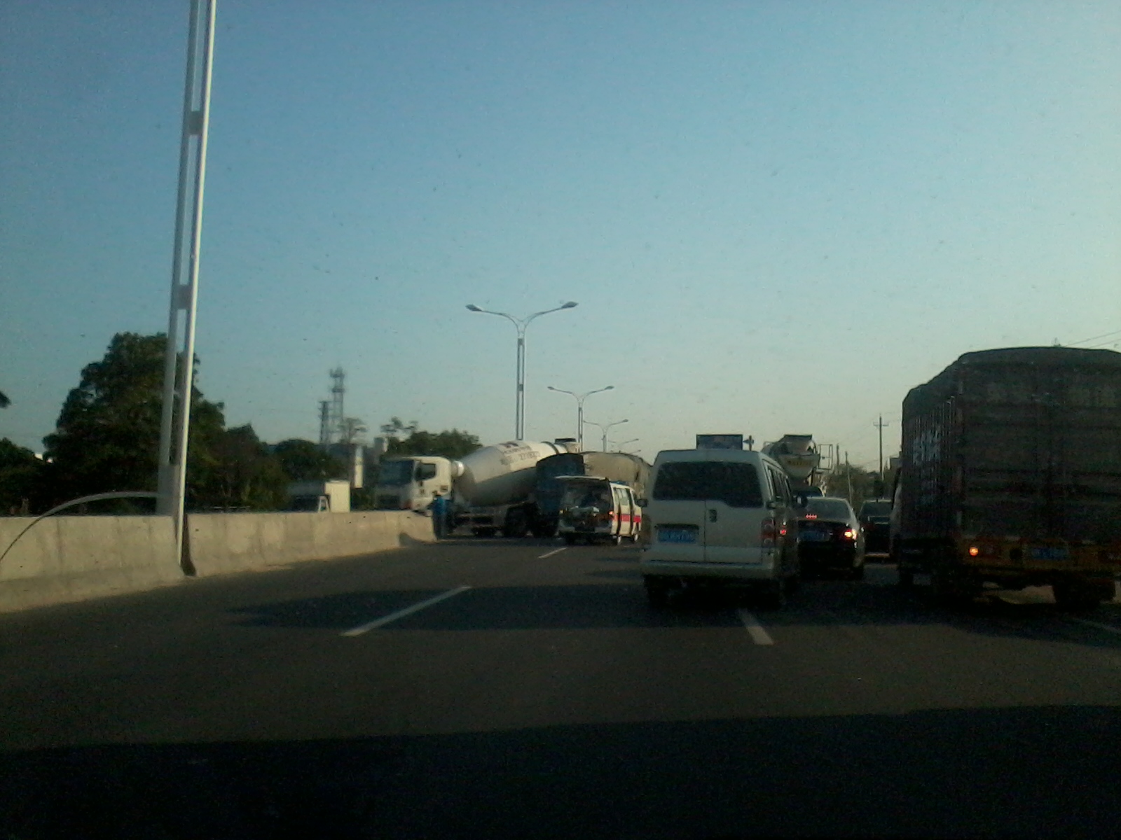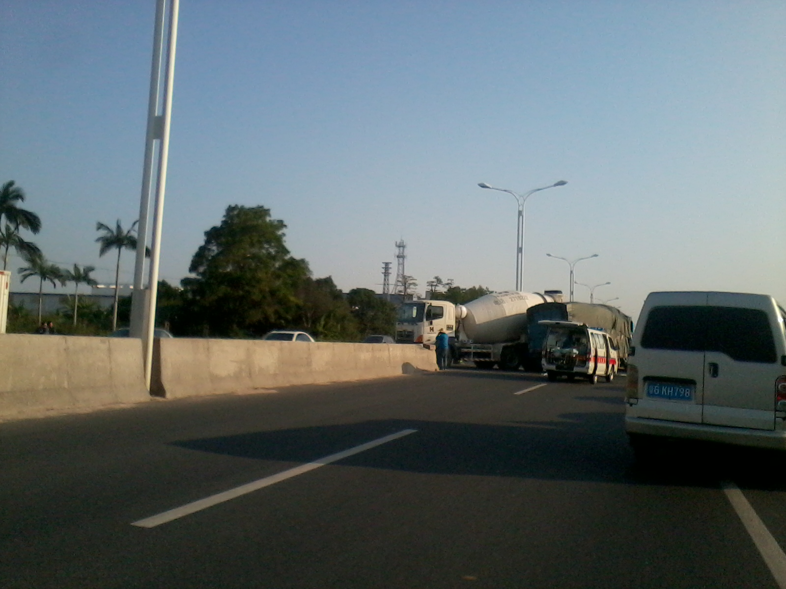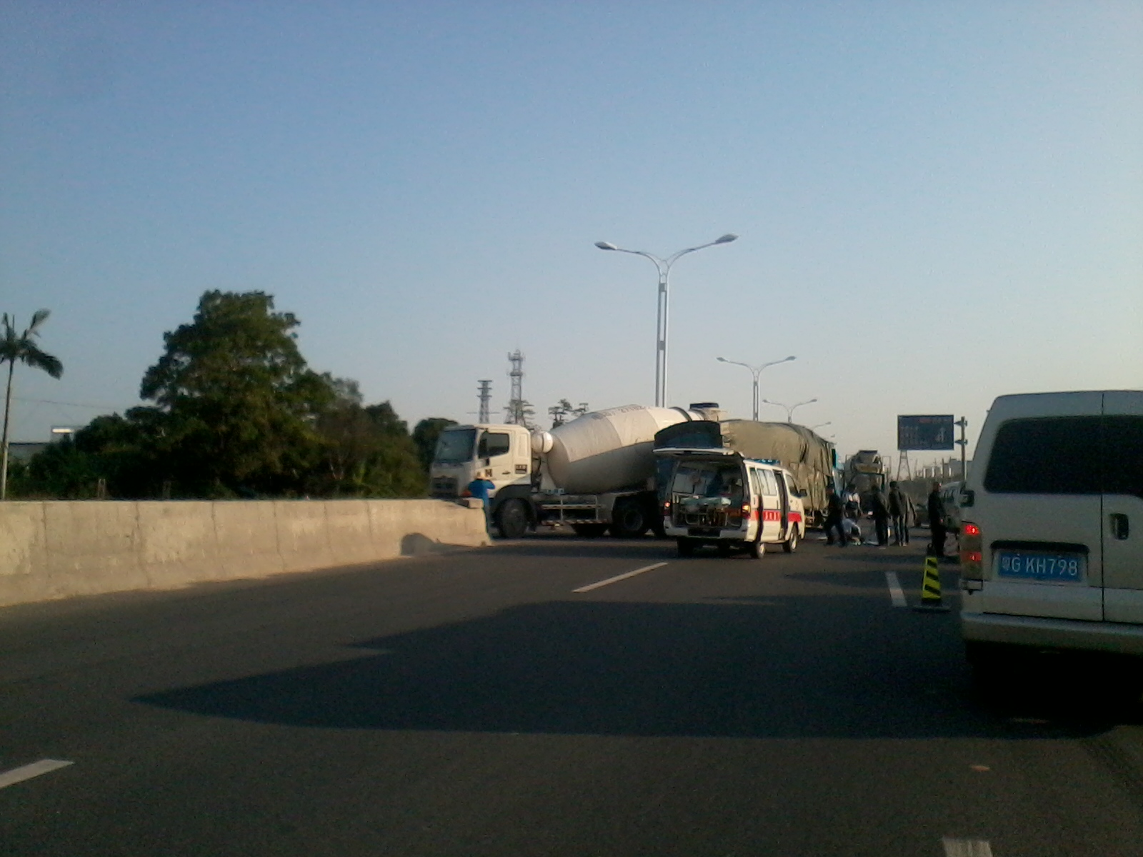 今天下午4点左右,在乙烯工业区高水路段,疑一辆田螺车横过高水路调头,另一辆货车减速不及,亲上了,造成货车头重伤,司机由救护车接走。