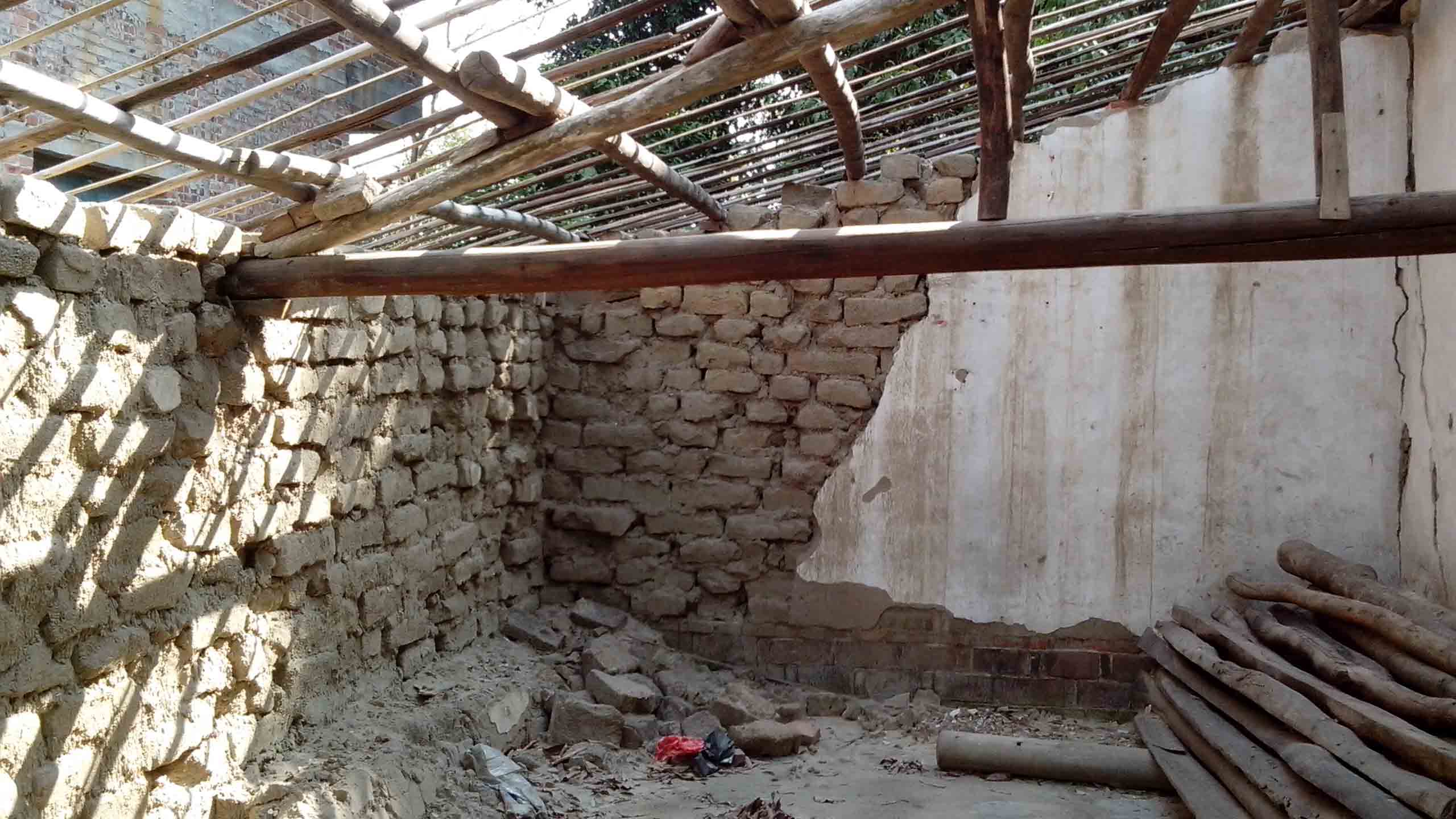 邻居帮忙在塌剩下残留墙根搭建成这个样.这半年来肓人五保户王全才只好住在这里,任凭风吹雨打,日晒雨淋!
