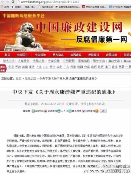 中央下发《关于周永康涉嫌严重违纪的通报》