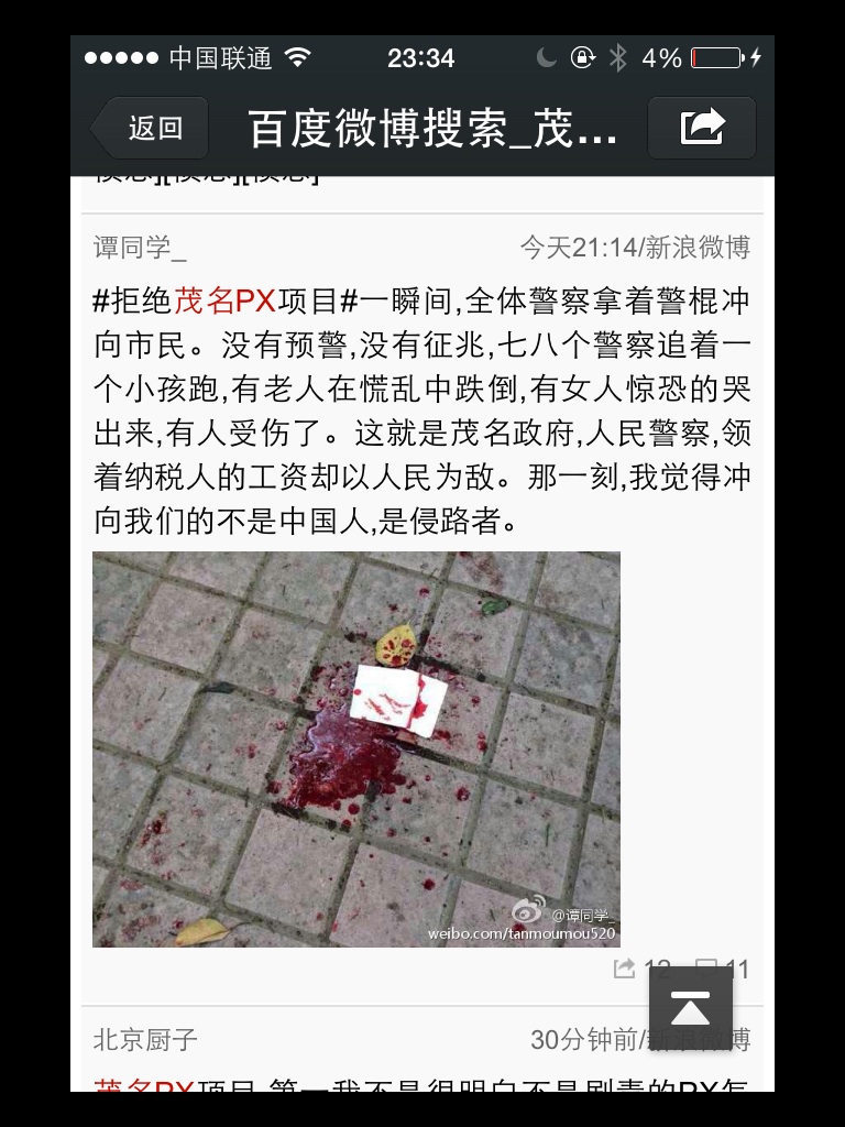 论坛非主要信息来源,所有图片引自微博,微博已经铺天盖地,在广州公交车上看到两个小女孩拿着手机看着朋友圈在讨论:茂名发生什么?偷瞄一眼,都是血腥相片,另外一个女孩要求赶紧不要看了