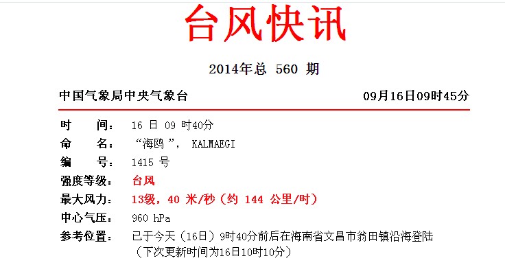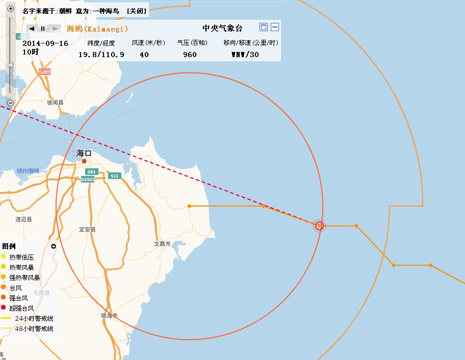 QUOTE(田园春色 @ 2014年09月16日 Tuesday, 09:34 AM) “海鸥”的移动速度非常快,达到每小时25-30公里。另外,目前“海鸥”云系庞大,几乎覆盖了南海大部海域,8级大风范围达300公里,广东沿海和海面自东向西先后将受大风影响的持续时间长,风雨影响范围广。 [snapback]3698400[/snapback] 请点击图片放大观看