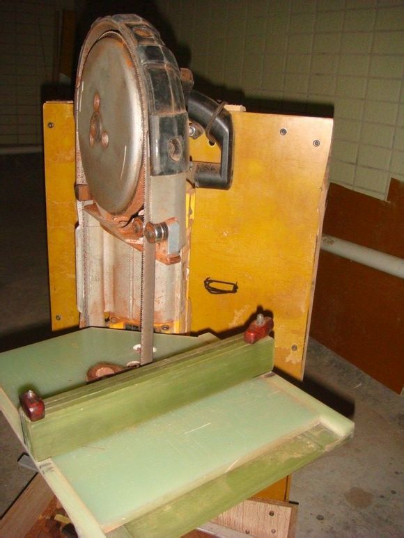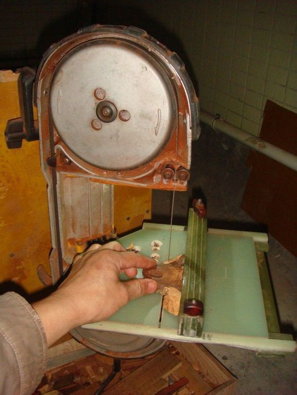 木料的裁切规整非常重要,裁切不规整,将导致做出来的佛珠上下错位。但带锯机选择使人头疼:大的带锯机贵而且阻地方,切割耗料大(3毫米锯路);小带锯机功率低,锯木不爽快。瞄了很久,最终用6个红毛头买了1台美国得伟二手便携带锯机,并自行改装成台式带锯使用。美国得伟的电动工具,结构巧,质量好,其电机似乎永远不会坏,但缺点是易耗配件难找。这种便携带锯机主要用于手提锯钢铁铝材,功率强劲,使用的是0.4毫米厚锯片。直接改为台锯锯木,很容易断锯条。我在换了好几条0.5毫米锯条(0.4毫米厚的锯条无法买到)才悟出它容易断锯片的原因是原锯条是经过扭曲安装的,并且张紧过度。我通过改变其导锯片轴承组安装方式使锯片顺直和放松锯条之后,顺利解决了锯木断锯条的问题。这种锯机使用双金属锯条,非常锋利,切紫檀爽利,精度也好,实木工diy者居家锯小木料之首选也。