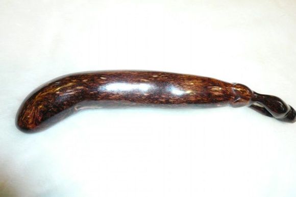 鬼脸分狭义和广义。狭义鬼脸,就是真鬼,即脸上器官齐全,形象狰狞,须髯爆炸。这是种具象,非常少见,俗称“一脸抵万金”。广义鬼脸,即结节或树杈砍下后留 下的横断面,这种鬼脸较常见,有些是成排结对的,很壮观。越黄中这样的鬼脸其实也很多,只不过脸更大,也不如海黄鬼脸生动传神。紫檀和酸枝木中也有这种鬼脸。