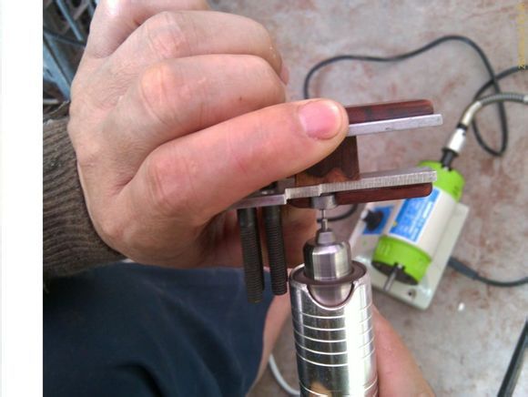 开孔的方法和过程:利用台钻开孔,由于钻头过小,可能会出现孔不垂直的现象,经过再三研究,决定改用双向开孔的方法,并做了个导钻装置夹,这样双向钻出来的孔垂直。