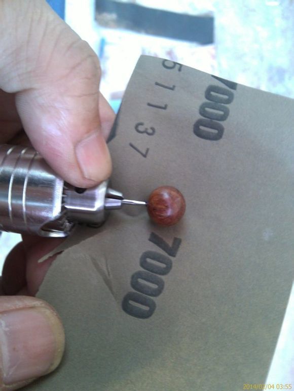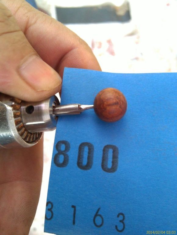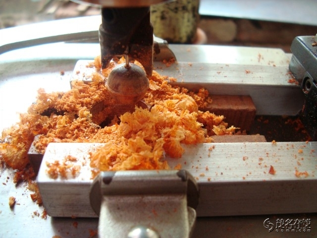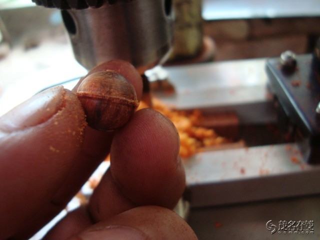 首先做一个固定木块的装置,根据实践测试,这种固定装置比台钳好,用台钳固定有可能出现晃动,从而导致佛珠刀蹦刃或断钻芯。二是把方块木料放在这固定装置上旋紧螺帽把其夹紧,保证其纹丝不动。三是把台钻的钻速调到最低,开动钻机,把握好给进速度,宁慢勿快,尤其是在钻第二面将近到断口的时候,要尽量减慢给进速度。能做到珠面光滑、上下不错位、中间断口控制在0.5毫米以下,出来的珠子质量就已经相当好,再通过打磨稍微修正,就大功告成了。