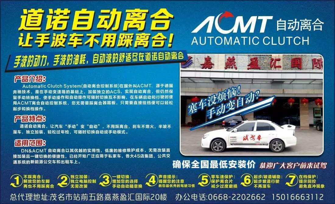 产品介绍:Automatic Clutch System(自动离合控制系统)在国外叫AcMT,是在手动变速箱的基础上,加装独立的ACS,实现自动离合,但仍然保留手动换挡。该技术也被众多国外著名汽车品牌所运用,如奔驰A160和A190,宝马M3,法拉利360,阿尔法156,萨博900,雷诺Twingo等著名车型。其优势十分明显:与手动挡相比,其驾驶操控更加简单,具有动力强,驾驶舒适的特点;与自动挡汽车相比,具有造价便宜,维修经济,省油等特点,尤其适合讲究驾控感又注重舒适感的城市驾驶者和驾驶新手。