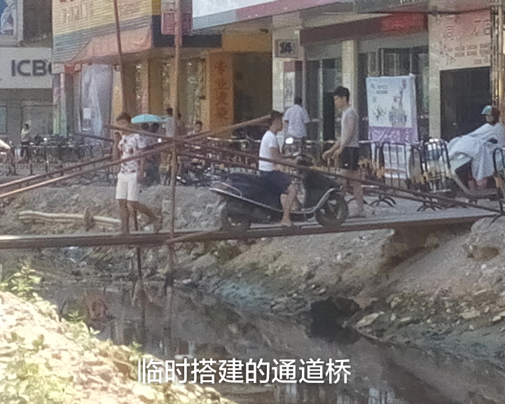 被挖开的路已经成为一条臭水沟,行人只能通过临时搭建的桥进出。