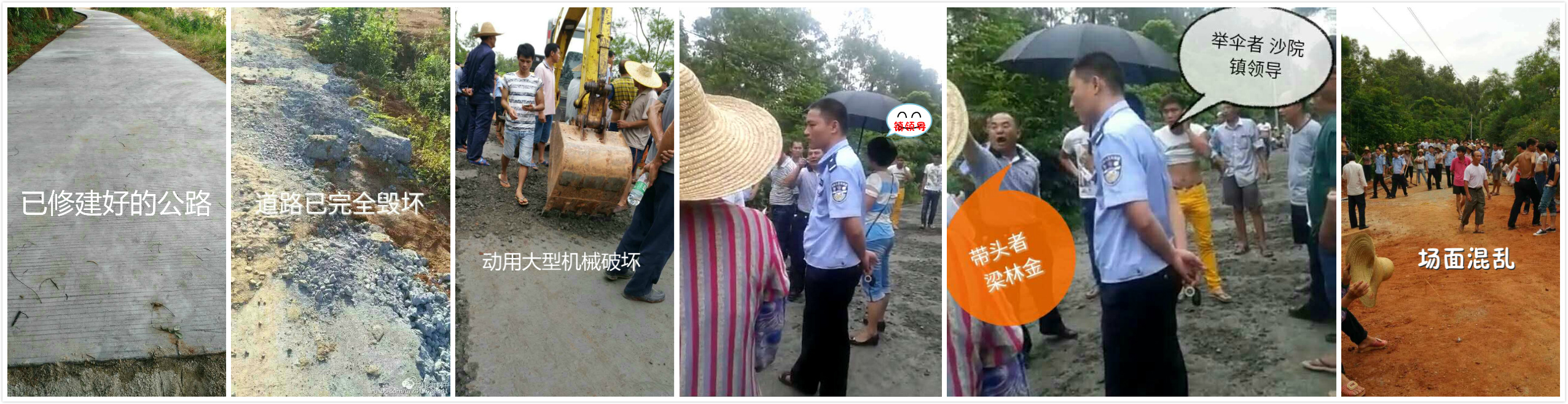 一、8月15日,茂名市电白区沙院镇六逢村多名村民以梁林金为首,带领不明身份的人约二百余,动用大型勾机大肆破坏邻村龙眼山村刚硬化完的一段百年老路。镇领导和民警及时阻止了一场几百人的械斗,但阻止不了道路的继续被摧毁,造成了龙眼山村巨大的经济损失。并且造成周边几个村落一千多人出行困难。至今,以梁林金为首的一帮匪徒乃未受到任何约束,难道他们的行为就不属于违法吗?