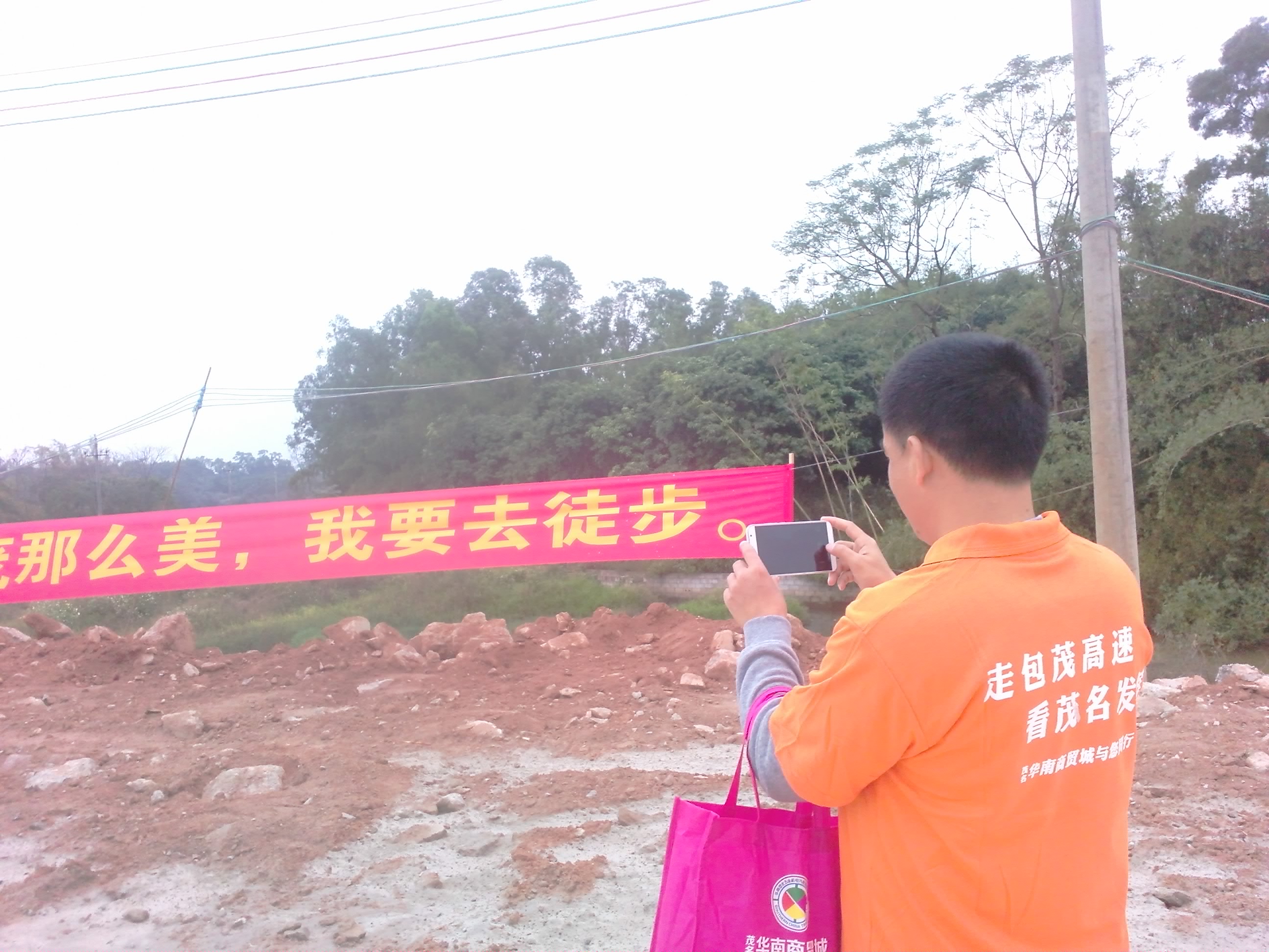 一徒步者正站在“茂名那么美,我想去徒步”的横幅前拍照留念。
