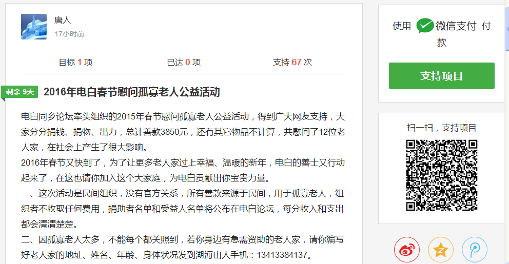 电白同乡论坛牵头组织的2015年春节慰问孤寡老人公益活动,得到广大网友支持,大家分分捐钱、捐物、出力,总计善款3850元,还有其它物品不计算,共慰问了12位老人家,在社会上产生了很大影响。