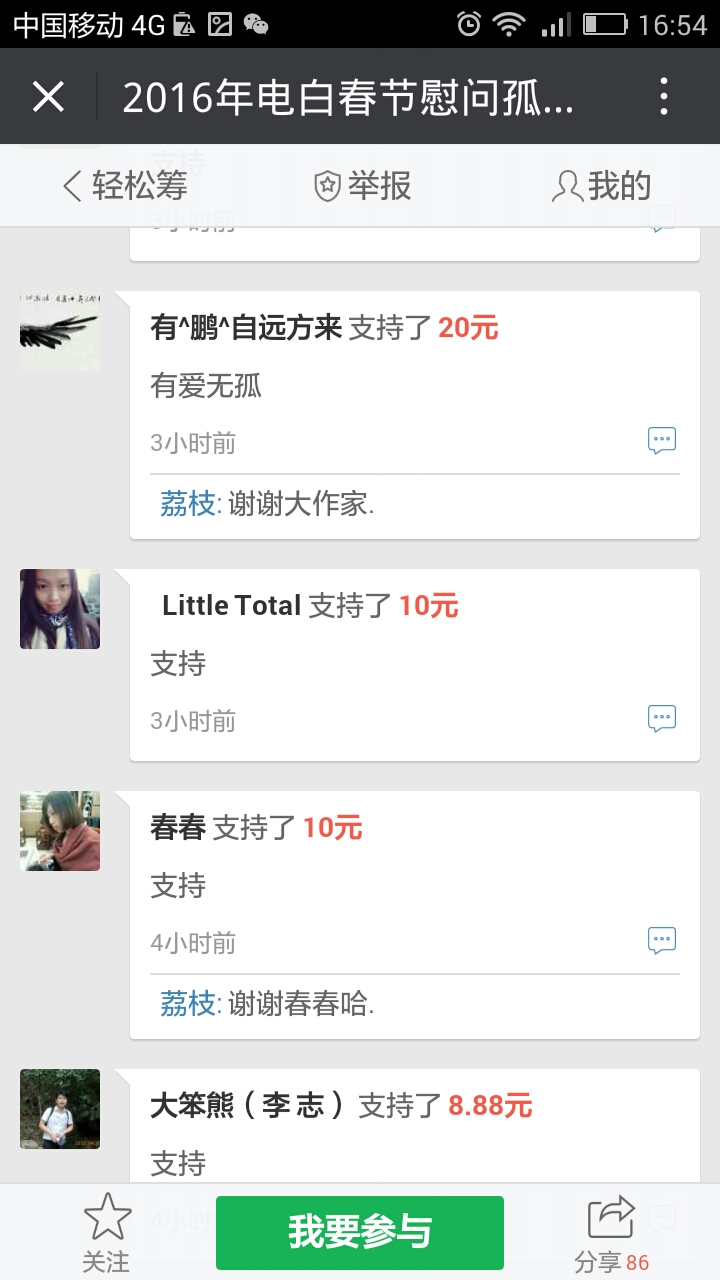 这是唐人(清心)在轻松筹所写的: