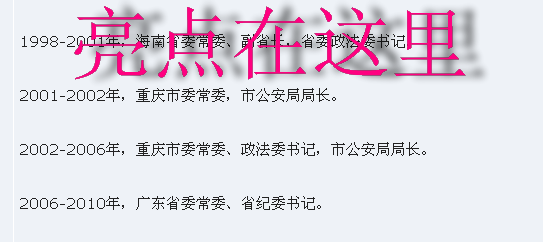 2002-2006年,重庆市委常委、政法委书记,市公安局局长。