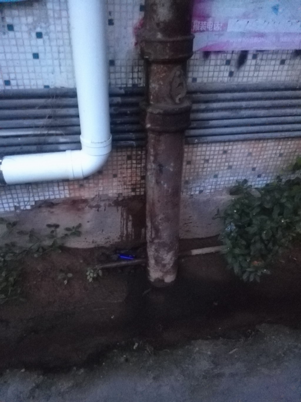 水东镇新湖一路的中国银行宿舍楼原排污管是用铁管,早已破损,污水横流、几经相邻住户反映,前十多天更换了二根排污管,好了有二天,因还有一根排污管破损不换,且可能化粪池堵塞,近几日污水横流更甚,恶臭难闻,苦了相邻住户及过路的群众。