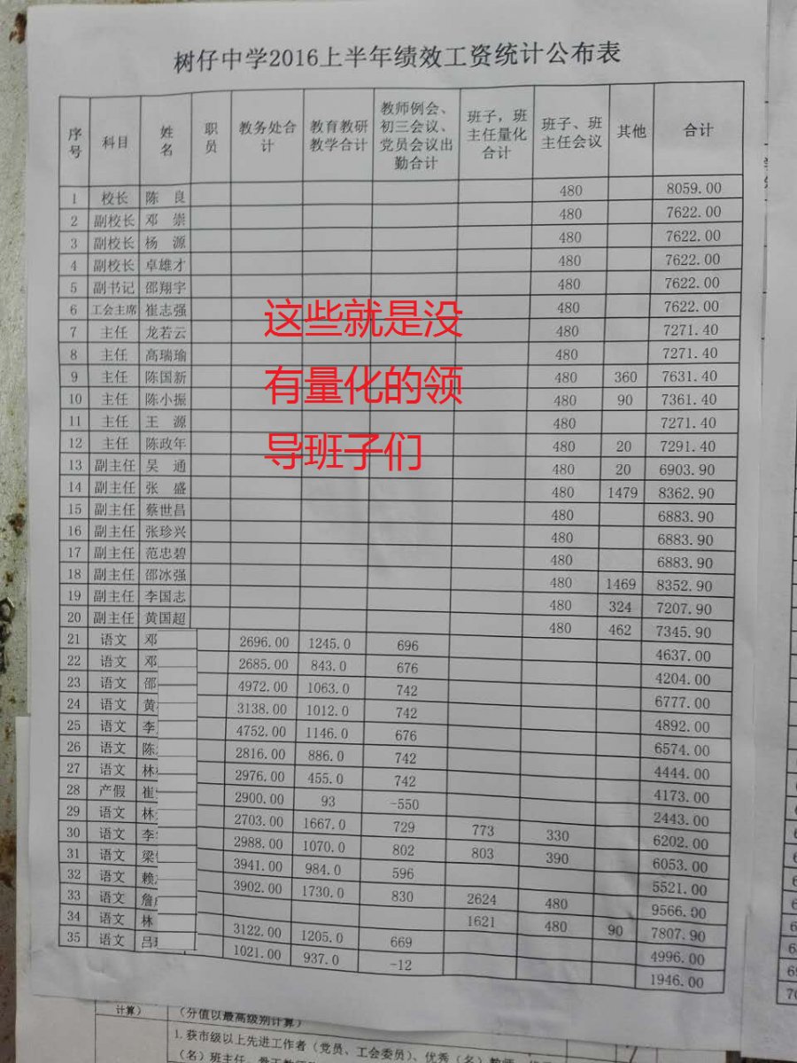 树仔中学的绩效难道是专门为那些领导班子设立的吗?所谓的量化,为什么只量化普通老师,而不量化那些领导班子,那些辛辛苦苦上课,工作的老师们只能得那么点可怜的绩效,而那些所谓的领导班子什么都不用做就能领到比普通老师要多得多的绩效。老师们不服,这是我们的血汗钱,凭什么被他们无耻地霸占了。请问,教育局的有关领导们,你们有关心过下面老师的绩效发放情况吗?来我们学校调查下吧,为那些敢怒不敢言的老师们主持公道。也希望其他关心教育的人士也帮下忙。谢谢