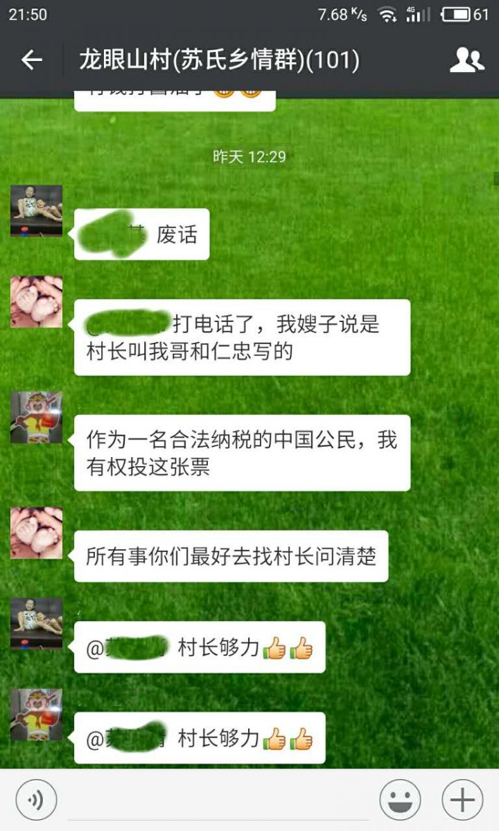 我们要了解事情真相,还我们一个神圣的使命,还选举一个公平公正公开的平台。这几天来,我们村村民想向村长苏仁辉问个明白,但村长一直不露面,不接电话。在村民的聊天中显示,龙眼山村的所有选票,由村长指定填写被选举人梁康华,交给苏仁培及苏仁忠两个人包办填写完成。