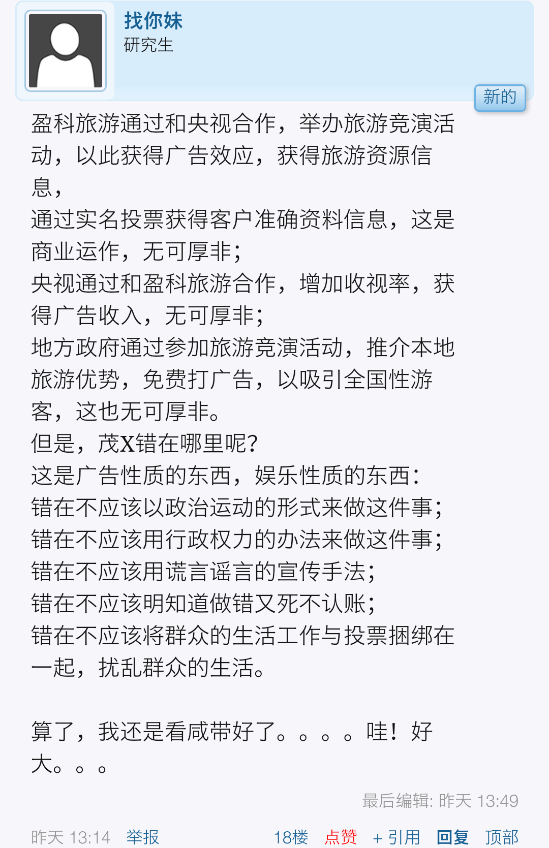 一场由政府牵头、全民动员的投票游戏,中央台、盈科旅游挣得盘满钵满,五亿的抽奖投票者中了多少?我只知道投票者的资料全被别人掌控于手中。