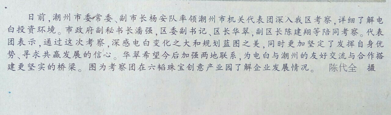 并详细了解电白投资环境。市政府副秘书长潘强,区委副书记、区长华翠,副区长陈建翔等陪同考察。代表团表示,通过这次考察,深感电白变化之大和规划蓝图之美,同时更加坚定了发挥自身优势、寻求共赢发展的信心。华翠希望今后加强两地联系,为电白与潮州的友好交流与合作搭建更坚实的桥梁! IMG_20170815_131622.jpg IMG_20170815_132356.jpg