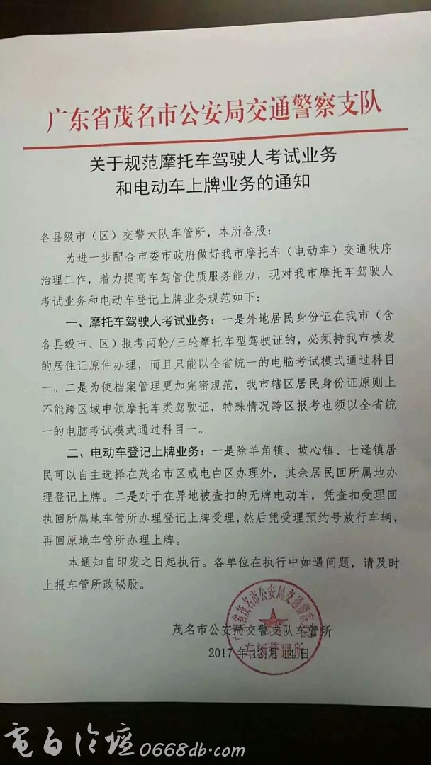 汪洋大盗 说: 在上个月上旬,电白公务员已收到<<茂办字【2017】74号中共茂名市委办公室、茂名市人民政府办公室关于全市机关事业单位工作人员积极参与整治摩托车电动车交通秩序大行动的通知》。 作为个守法公民,我赶紧到派出所了解电动车上牌事宜,说没收到通知,喊我到交警大队了解。我到交警大队了解电动车上牌事宜,交警说还没开始。 请问交警大队长,你们为什么要过了12月31号才开始上牌且只有一个上牌点?是故意的还是故意的还是故意的? 点击展开... 交警大队的,喊你三声猴子你敢答应吗?扰民如斯,能出来给交待吗?