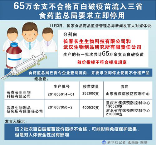 去年10月底,吉林省食品药品监督管理局通报称,长春长生(长生生物子公司)生产的"吸附无细胞百白破联合疫苗"【效价测定】项不符合规定。但原国家食品药品监管总局官网2017年11月3日发布的信息显示,除了长春长生,武汉生物生产的批号为201607050-2的百白破疫苗效价指标也不符合标准规定。