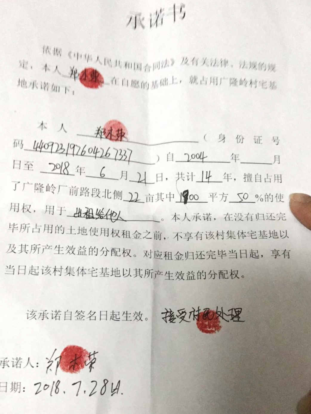 郑木荣 签署承诺书同意退还占用村民集体土地租金,并接受村民处置。