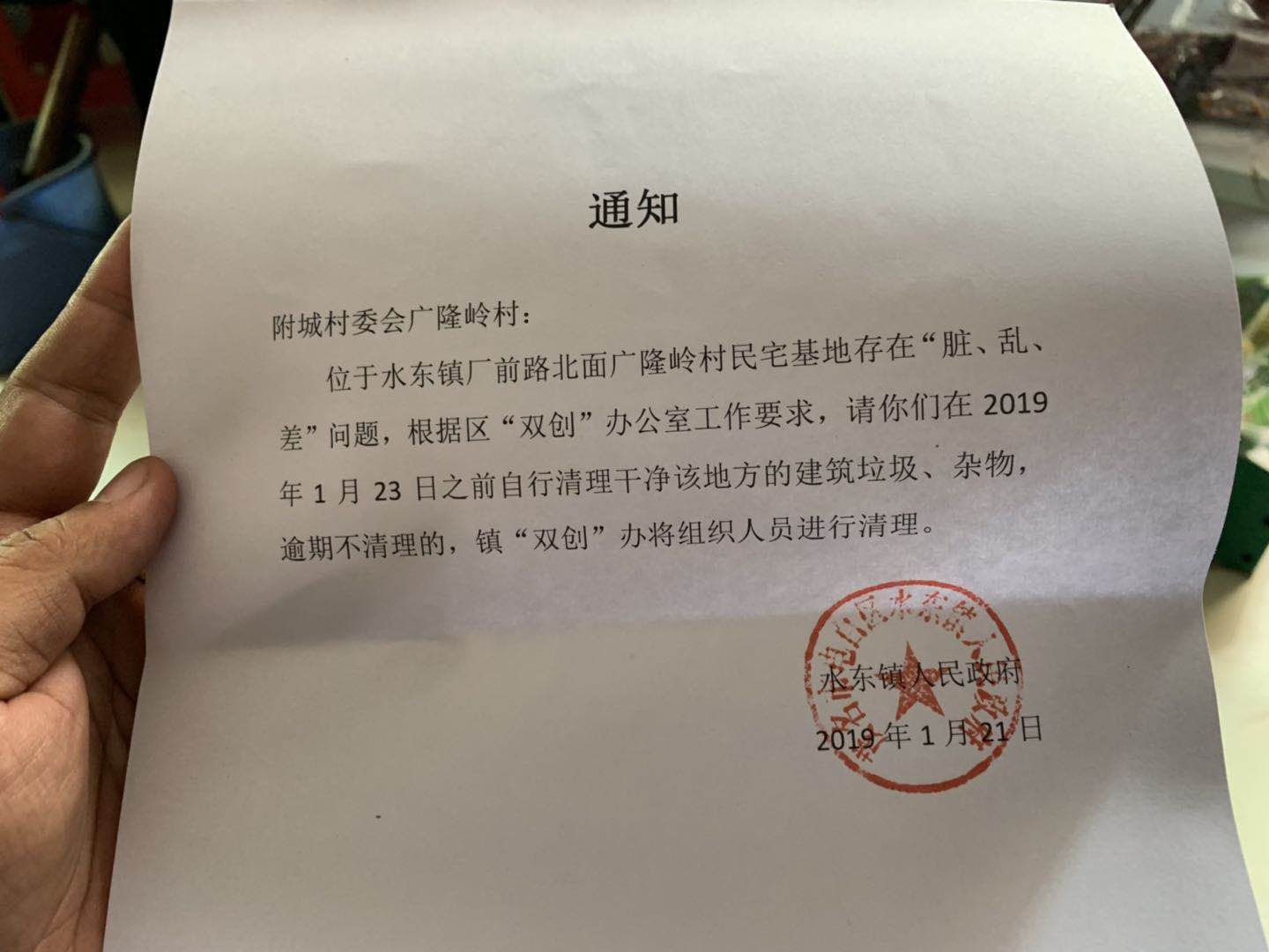 政府为了搞双创,由水东镇人民政府出文件请广隆岭村清除厂前路北侧宅基地里强拆违建后余留的建筑垃圾。