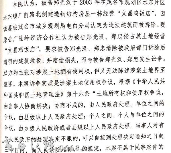 由于打字慢,先引用这位打黑小组的文字说明。广隆岭村向电白区法院起诉郑忠和郑壮(郑光汉)。据村民反映,开庭之前村里去法院递交材料时黄敏法官的态度就不是那么友善。这次法院驳回我们村民对村霸的上诉请求,在证据充分条件下依然将土地侵权行为枉判为土地确权问题,不属于法院所管,皮球又踢回到电白区人民政府。众多村名严重质疑其中一定有黑箱操作,官匪同流合污,目前村里继续向茂名市中级人民法院上诉中。