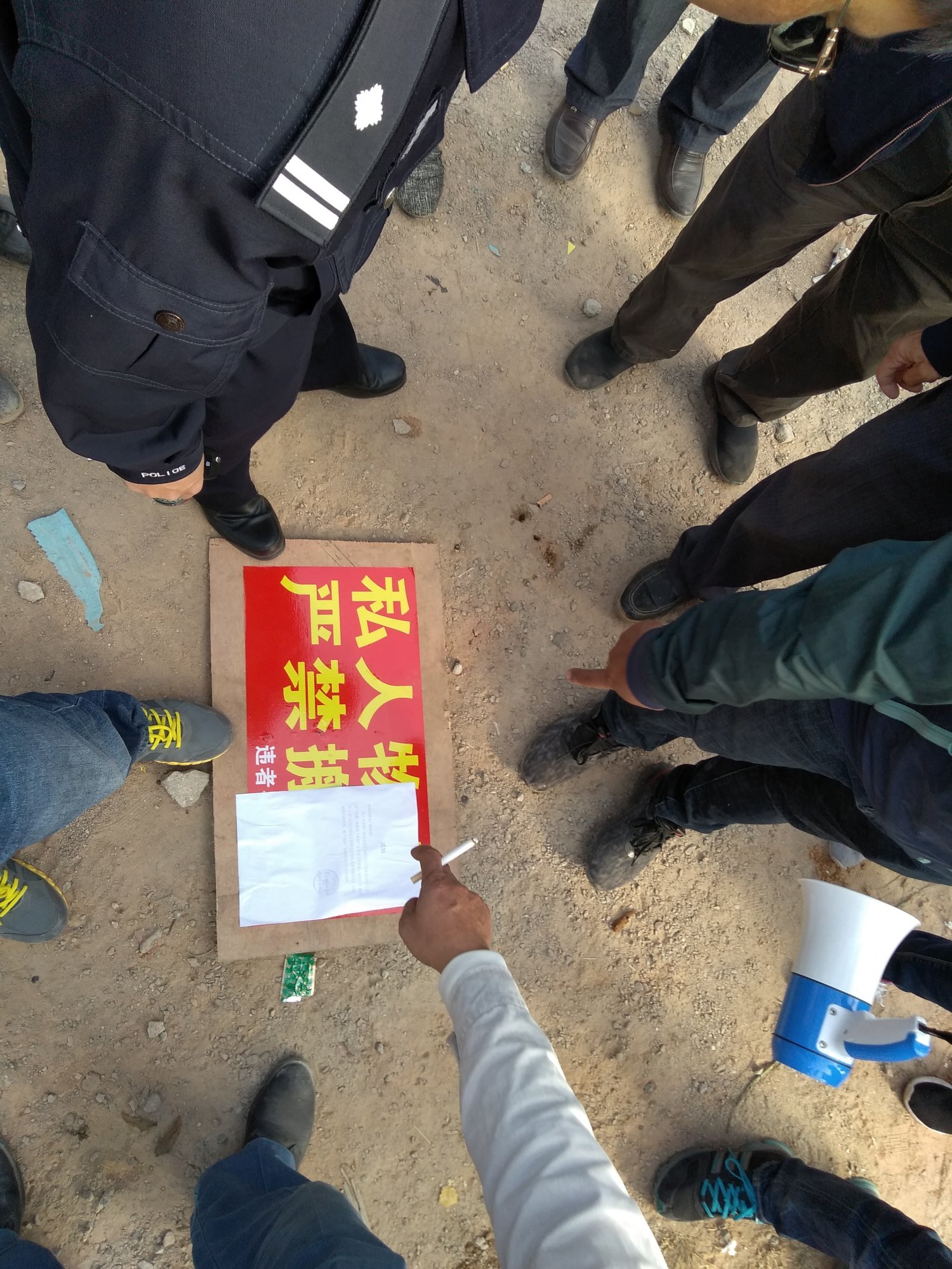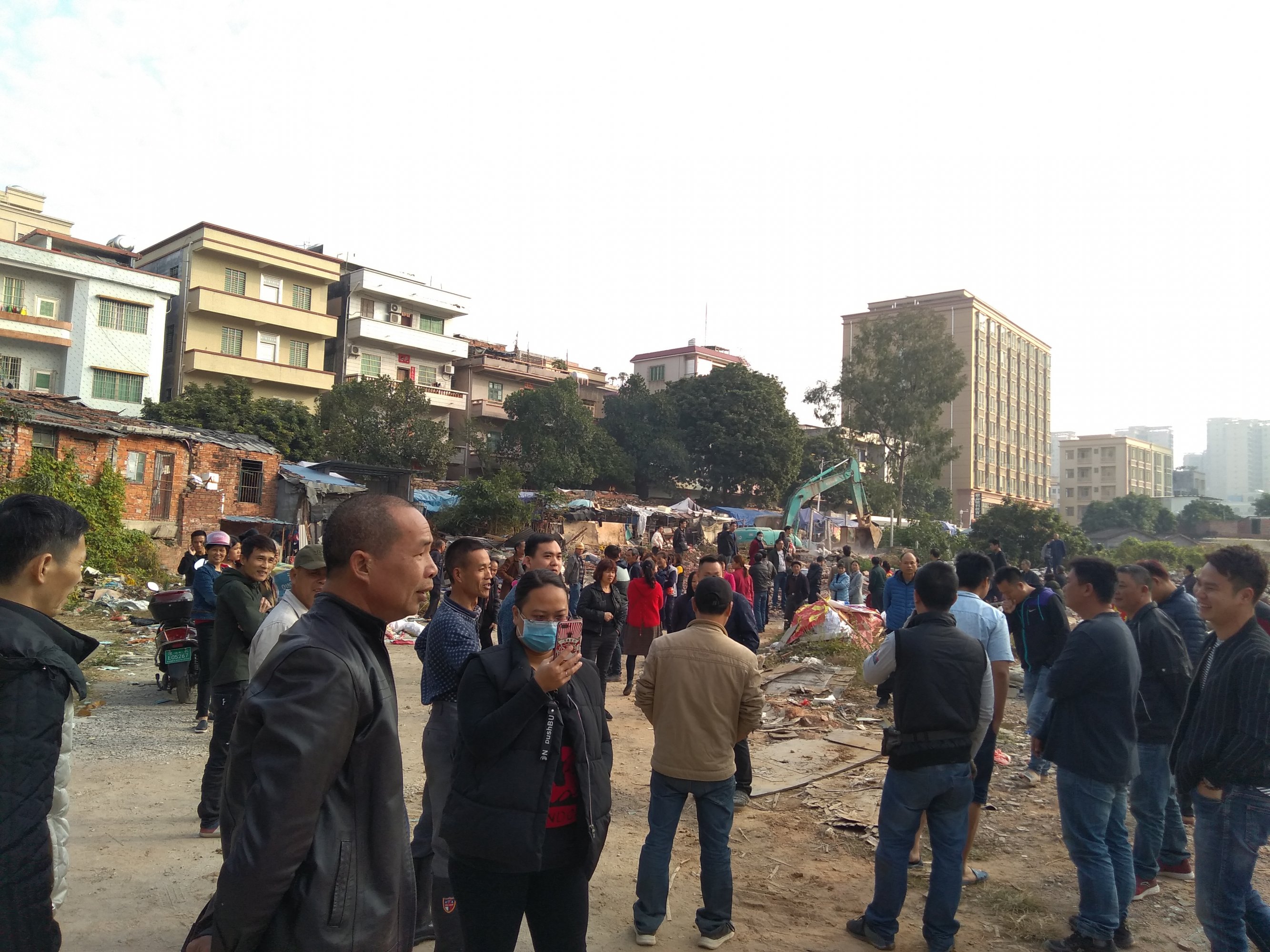 今天村霸郑忠出来阻拦清除垃圾,在政府2次强拆时郑忠已经扬言谁碰他一个砖头就烧掉人家挖掘机,今天他果然胆大去这么做了,他手持砖头冲来准备打挖机师傅,他的打手公子整在远处接应。村民们见势不妙赶紧跑去围挡拦下,不知道三角墟派出所现在请郑忠回去调查问话没,听说公仔整打电话给管区陈清香,说要叫人做几个村民,明天拭目以待。