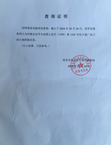 之前发帖至电白论坛,汪洋大海兄说刘观水在某书法群说烂仔拆他屋,说自己证件齐全,在网上到处喊冤造谣。其实刘观水不但霸占他人土地,而且还伪造买地协议刻假章办了假证,在政府有关部门查询不到档案。