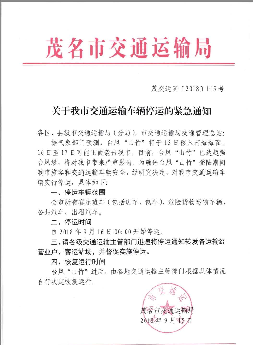 为确保台风“竹山”登陆期间旅客和车辆的安全,接上级主管部门的紧急通知,我司车辆将于2018年9月16日00:00起开始停运。