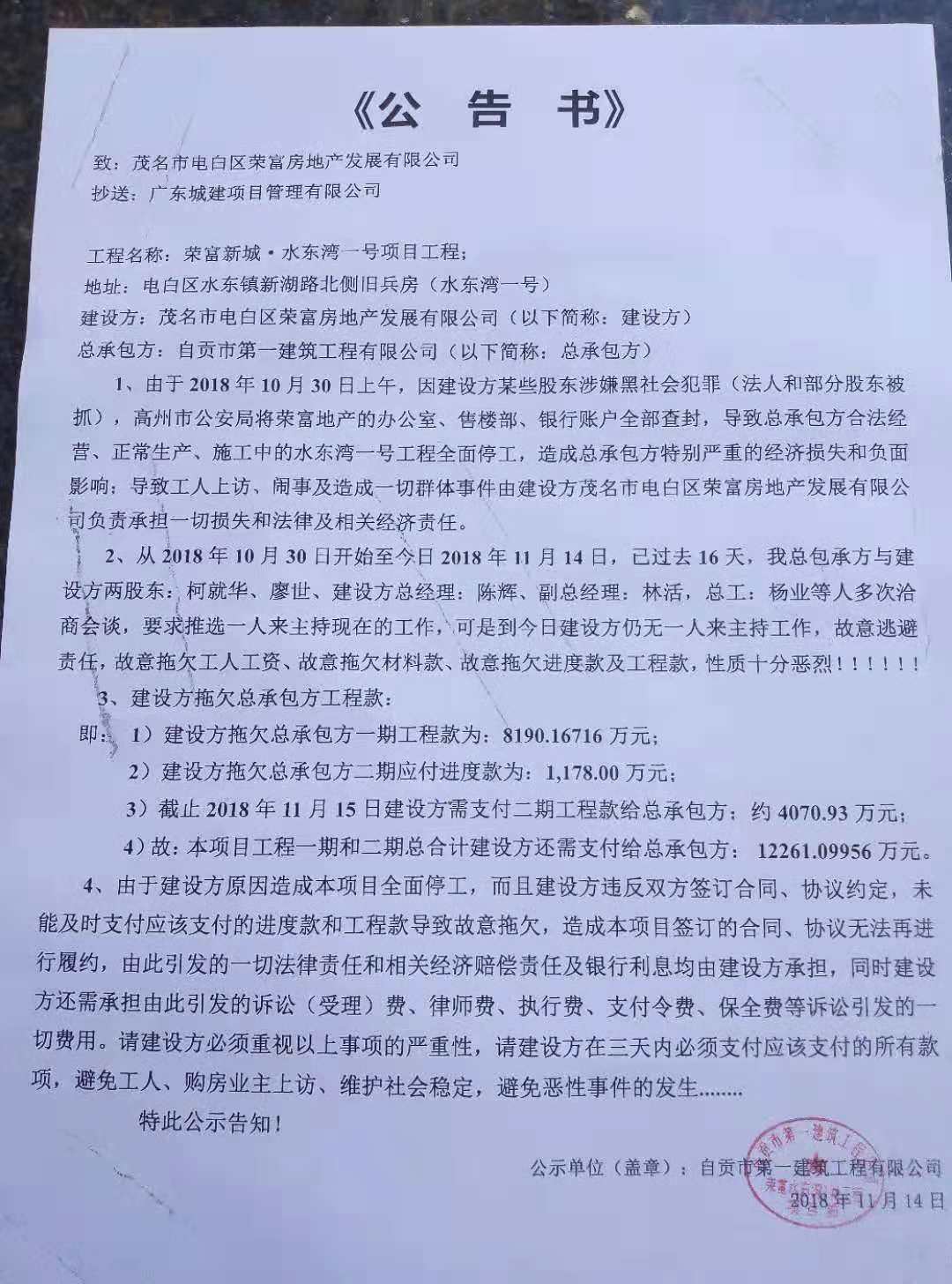 水东湾一号封盘事情,越来越引起大家关注 这件事,属于政府问题吗? 也引申出一个问题,在电白买房,还放心吗?黑心开发商一大推!!! 楼盘在没有取得任何证件的情况,销售期房,现在开发商出问题,导致期下项目被封,全面停工, 交了钱的业主苦不堪言,投诉无门?政府的监管呢?去哪里了?如果政府的领导,你们做好本分工作,少收点油水,他们敢这么猖狂? 希望政府能为我们平民百姓做主 打了十几年的工,挣点钱血汗钱 现在什么都没有了!!!!!!!!!